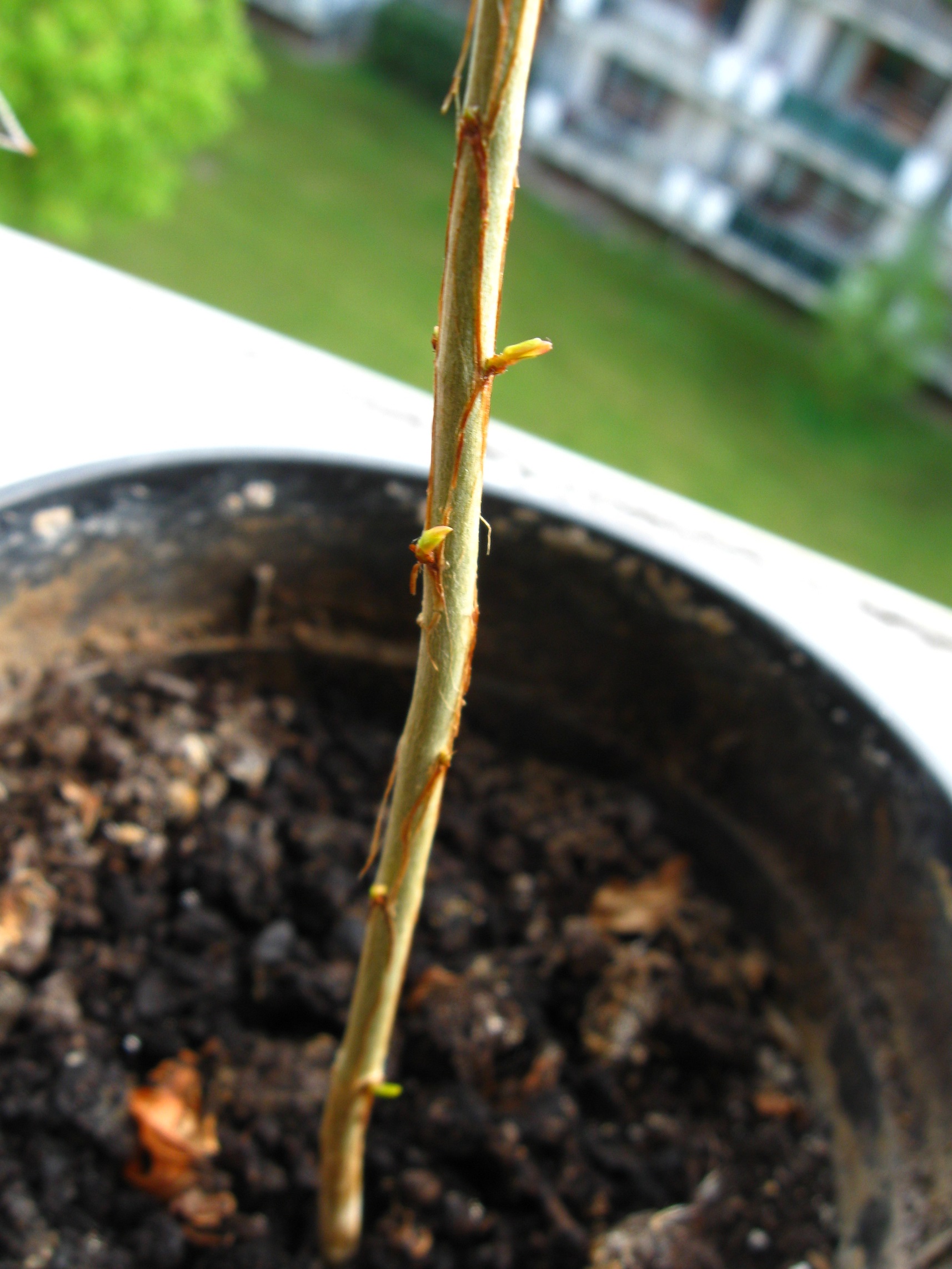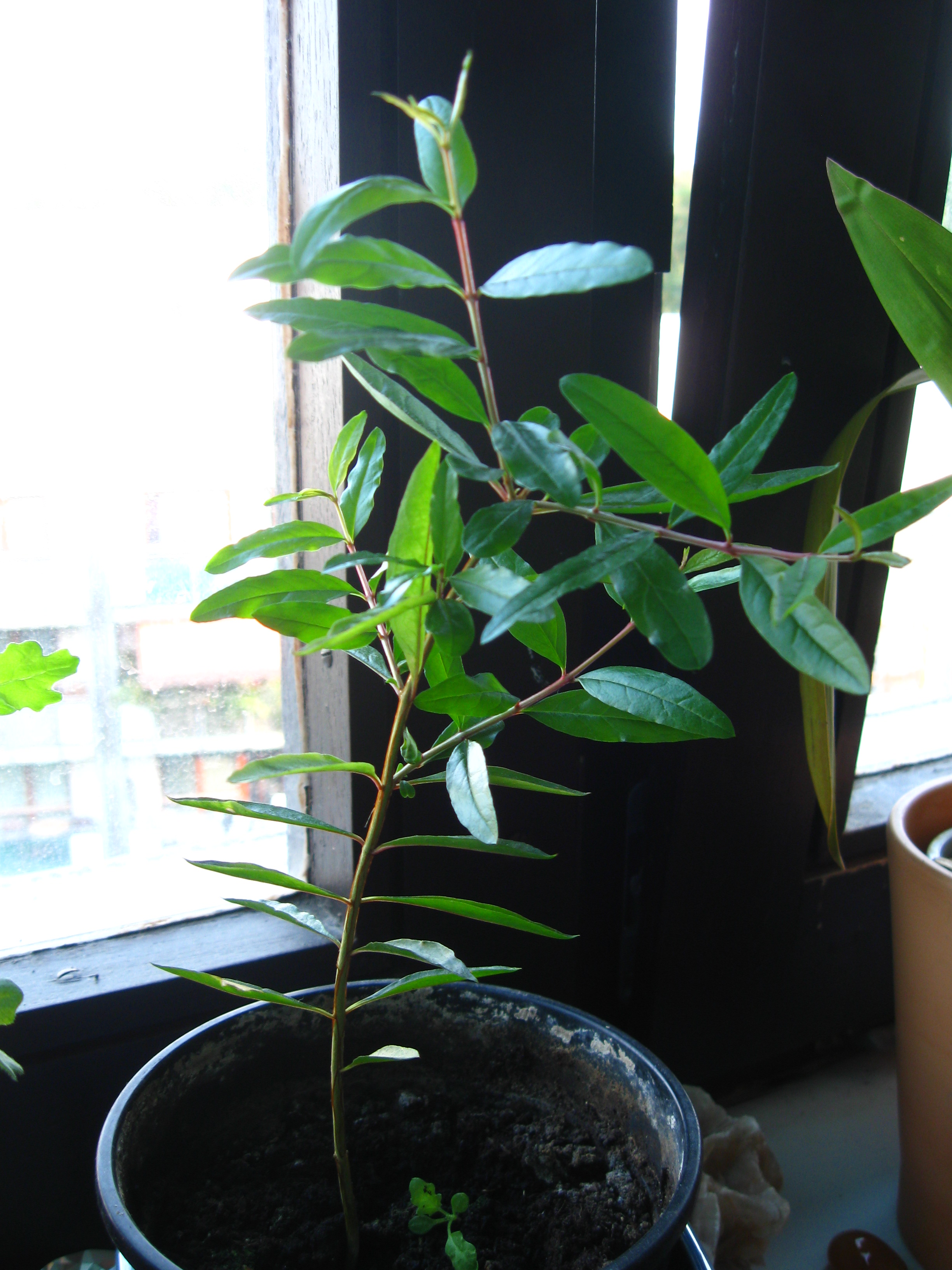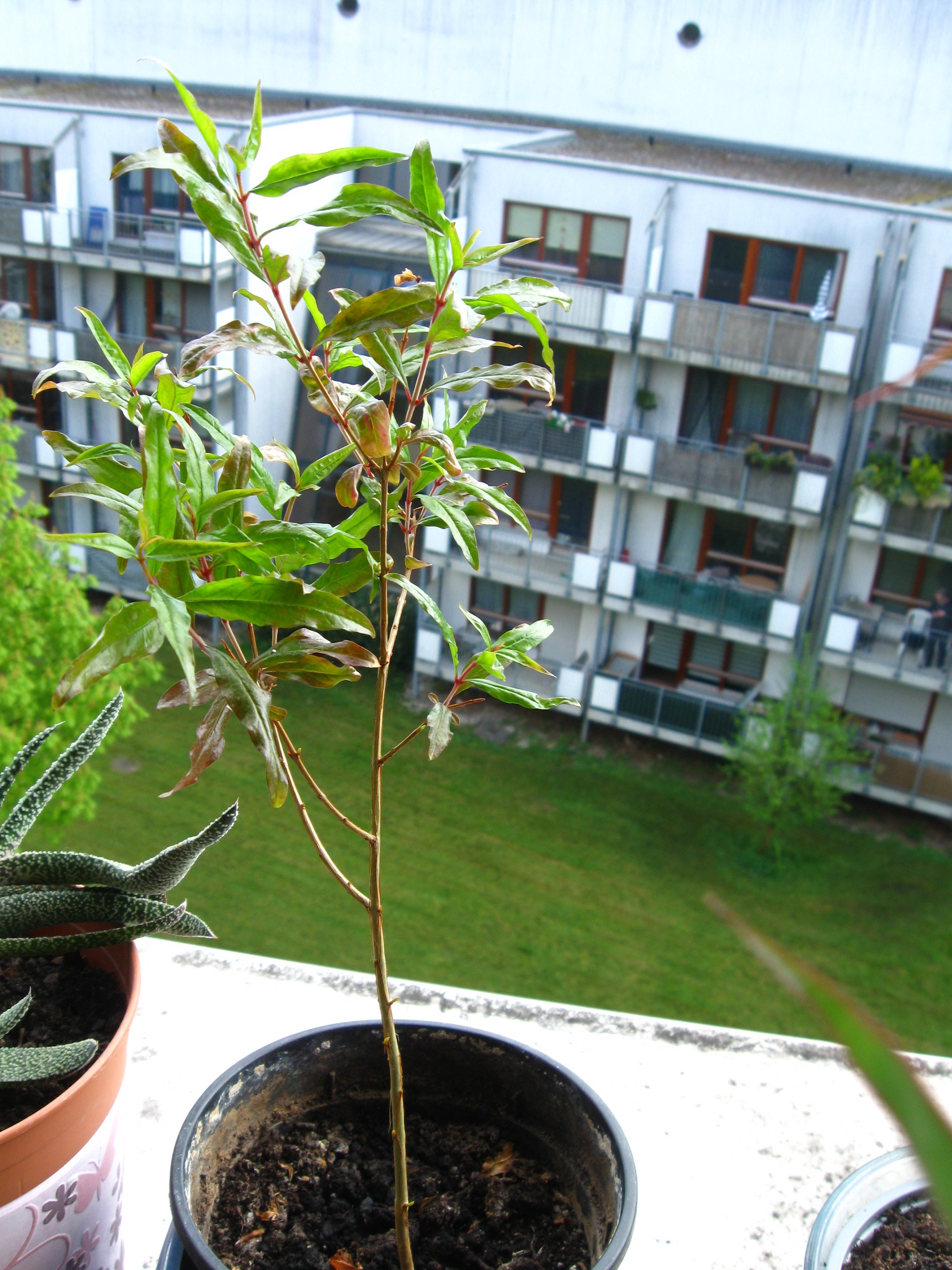 Außerdem habe ich auch noch eine Granate auf der Fensterbank stehen, die wohl auch ihr Laub abwerfen will. Die ist auch erst diesen Sommer geboren. Die Granate sollte aber doch eher drinnen bleiben oder?