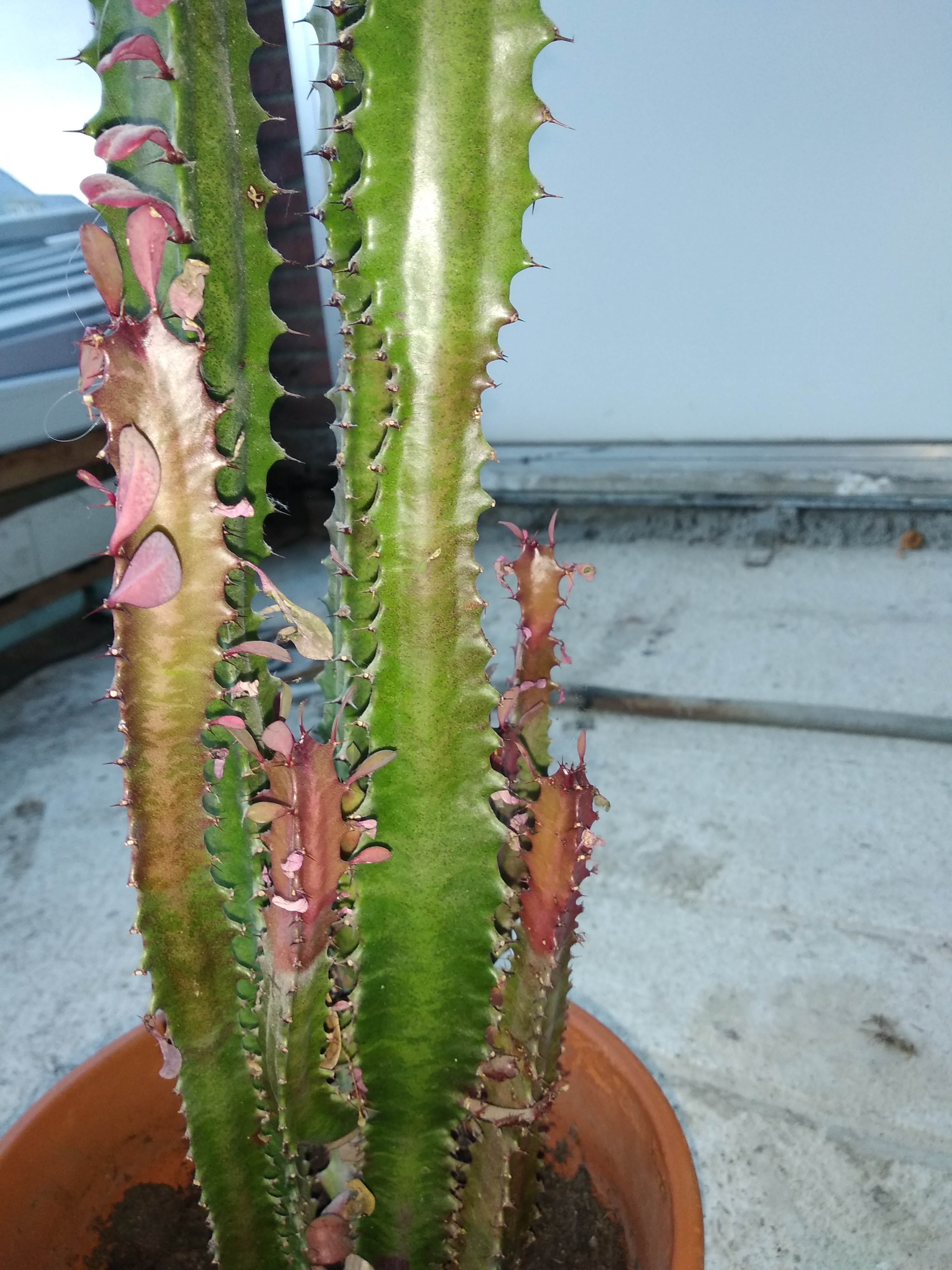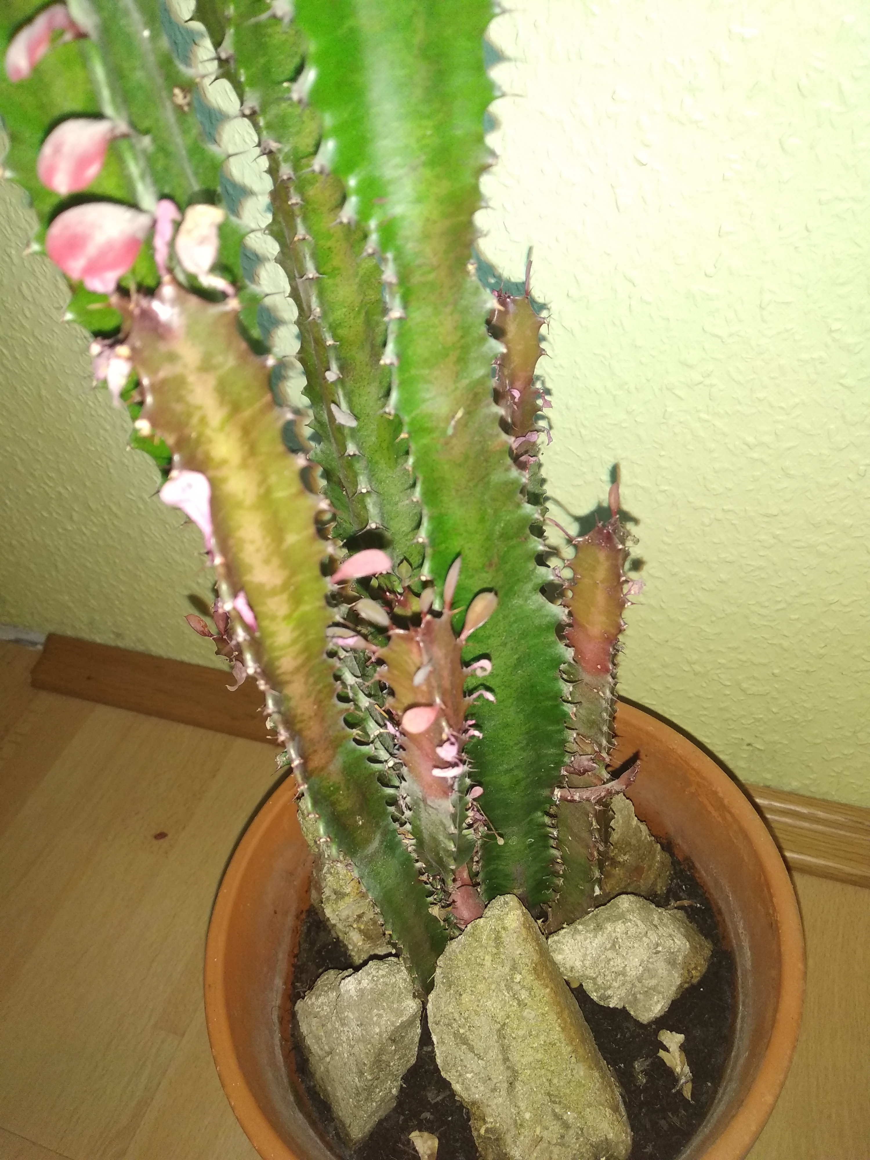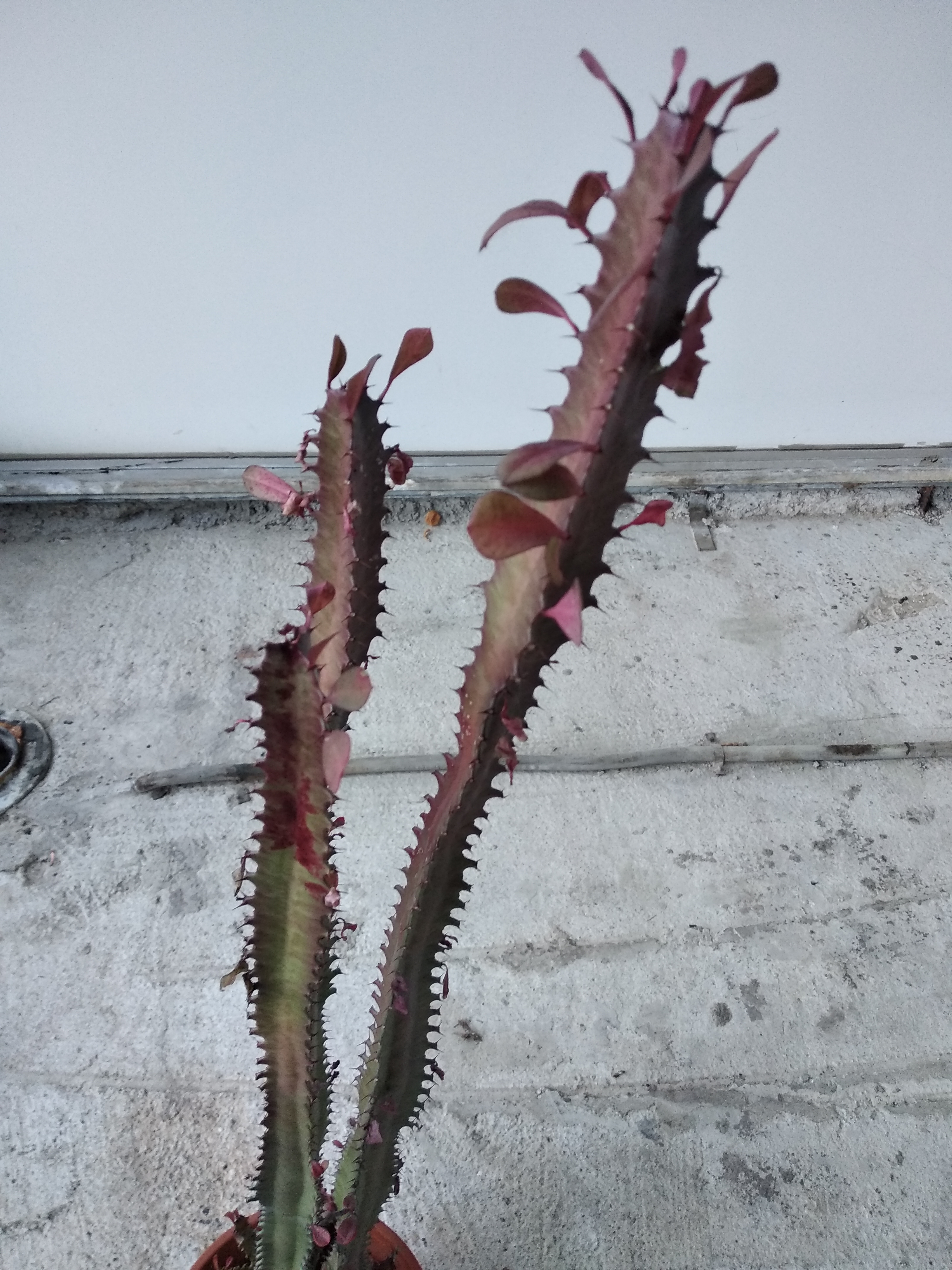 es ist kein Kaktus, sondern Euphorbia trigona. Die Rotfärbung könnte durch Sonnenbestrahlung entstanden sein. Beachte auch, daß es eine Euphorbia trigona f. rubra gibt, welche bei optimalen Bedingungen diese Rotfärbung besitzt.