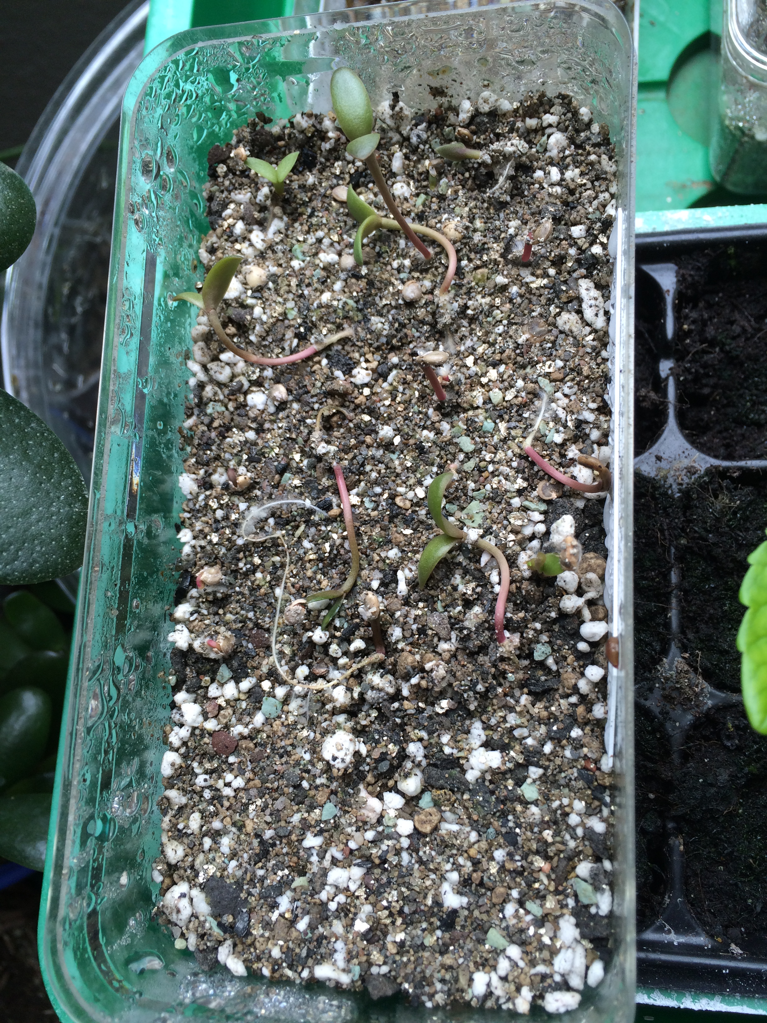 Der neue Opuntienmix in meinem beheizten Zimmergewächshaus in den Rochè Pötten ist gut am austreiben....nur wieder so auf einm Stängel mit zwei Keimblätter..... hat mal einer einen Tipp ob...bzw wie man das verhindern kann.