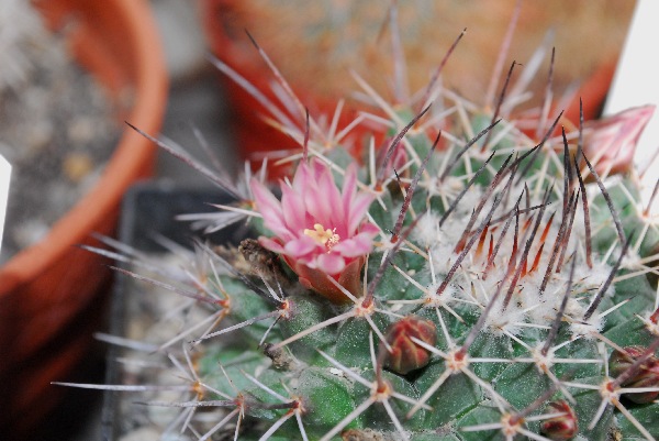 Und die erste Knospe von Mammilaria roseoalba ist aufgeblüht