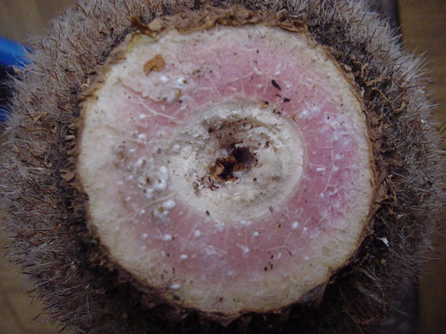 Heute sollten sie schonmal getopft werden, in trockene Erde. Der Kartoffelgeruch war immer noch da. Nach vorsichtigem Abschneiden stellte ich einen braunen Fleck auf der Schnittfläche fest. Scheibenweises Weiterschneiden zeigte, dass es sich um eine Art Gang in die Tiefe der Pflanzenbasis handelt. Dieser ist mit einer braunen, bröseligen Masse gefüllt.