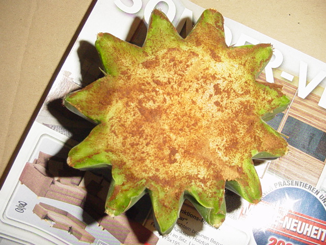 Bei anderen reicht der Gang tief ins Innere der Pflanze. Ein ca.15cm dickes Exemplar habe ich ausgehöhlt und nach etwa 4cm war nur noch gesundes Fleisch. Bei einem Weiteren ist der Gang noch tiefer.