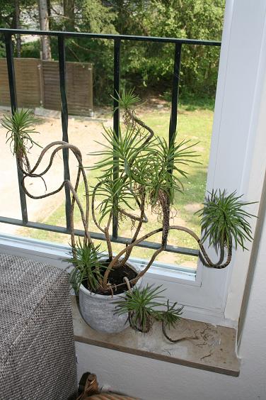 Außerdem stehen beide - soweit man das erkennen kann - in völlig unggeignetem Substrat. Außerdem stehen sie in Übertöpfen - Pflanzen sollten immer in Blumentöpfen stehen (also Töpfen mit Wasserabzugslöchern - alles andere ist kein Blumentopf); und dieser sollte bei Sukkulenten vorzugsweise auf einem Untersetzer stehen und nicht in einem Übertopf.
