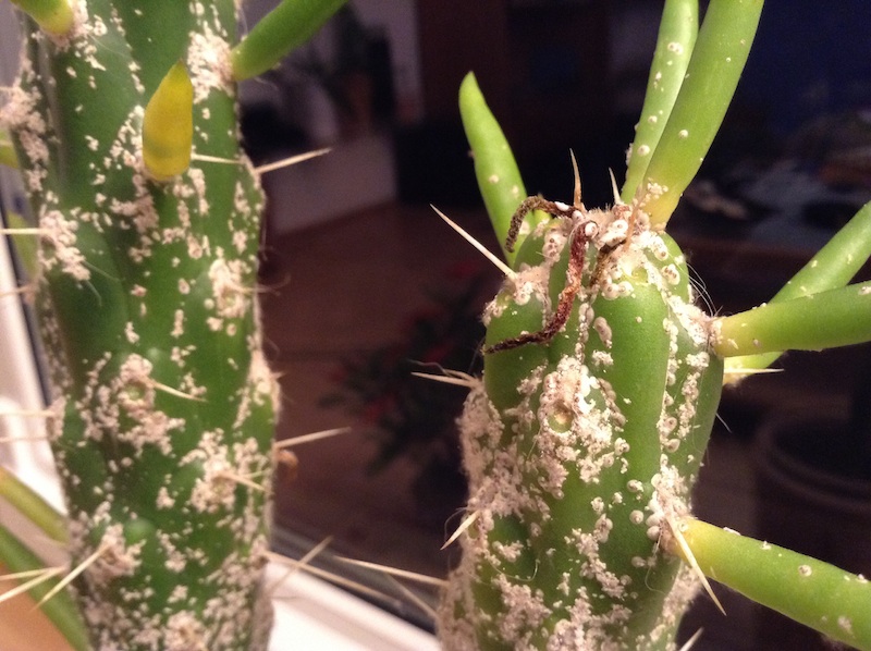 Seit einigen Wochen wird mein Kaktus von kleinen weissen Punkten befallen - mittlerweile ist fast der ganze Stamm benetzt. Die grossen grünen Stacheln fallen alle ab, nur die kleinen Dornen bleiben noch.