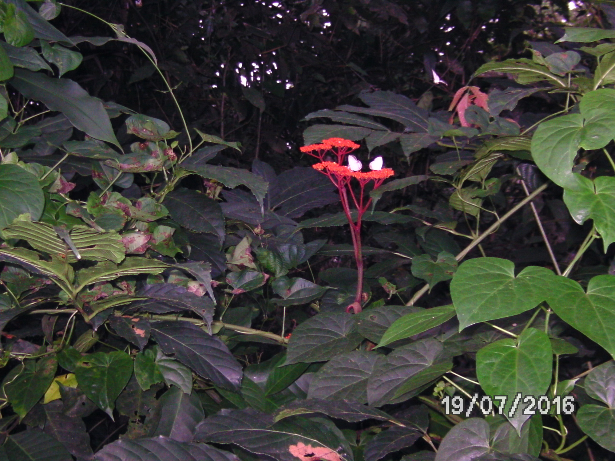 Hier noch eine letzte Kamerun-Pflanze, die ich nicht bestimmen konnte bei einem Foto, das bei ungünstigen Lichtverhältnissen aufgenommen worden ist. Auf den roten Blüten tummeln sich kleine weiße Schmetterlinge.