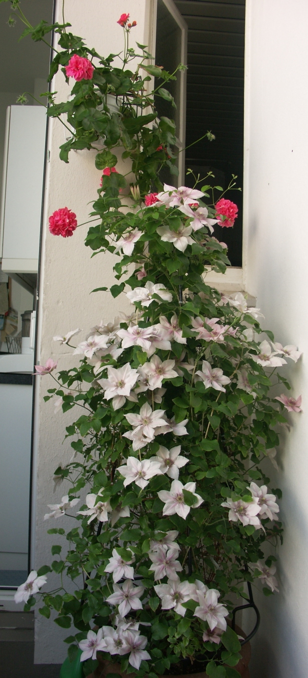 ich habe zwei Clematispflanzen "Pink Fantasy" auf dem Balkon in einem großen Topf stehen. Gepflanzt habe ich sie vor 2,5 Jaren und sie sind auch gut gewachsen. Die Lage ist hell durch cremefarbene Hauswände auch gegenüber, aber hat kaum direkte Sonne (erst am späten Nachmittag (im Sommer ab 17:00 sonnig). Pink Fantasy gehört zu den zweimal blühenden Sorten. Im letzten Jahr hat sie aber nur einmal geblüht. Im diesem Jahr im Mai haben sie sehr reichlich und wunderschön geblüht, danach war es bei uns einige Zeit sehr windig und leider ist ganz plötzlich alles Laub abgestorben. Die Pflanzen sind völlig vertrocknet, alle Blätter hängen aber noch dran. Ich habe die Pflanze dann gar nicht weiter beachtet, weil ich nicht wusste, ob sie überhaupt noch zu retten ist. Geschnitten und unternommen habe ich noch gar nichts. An einigen Stellen treibt die Pflanze jetzt zaghaft aus.