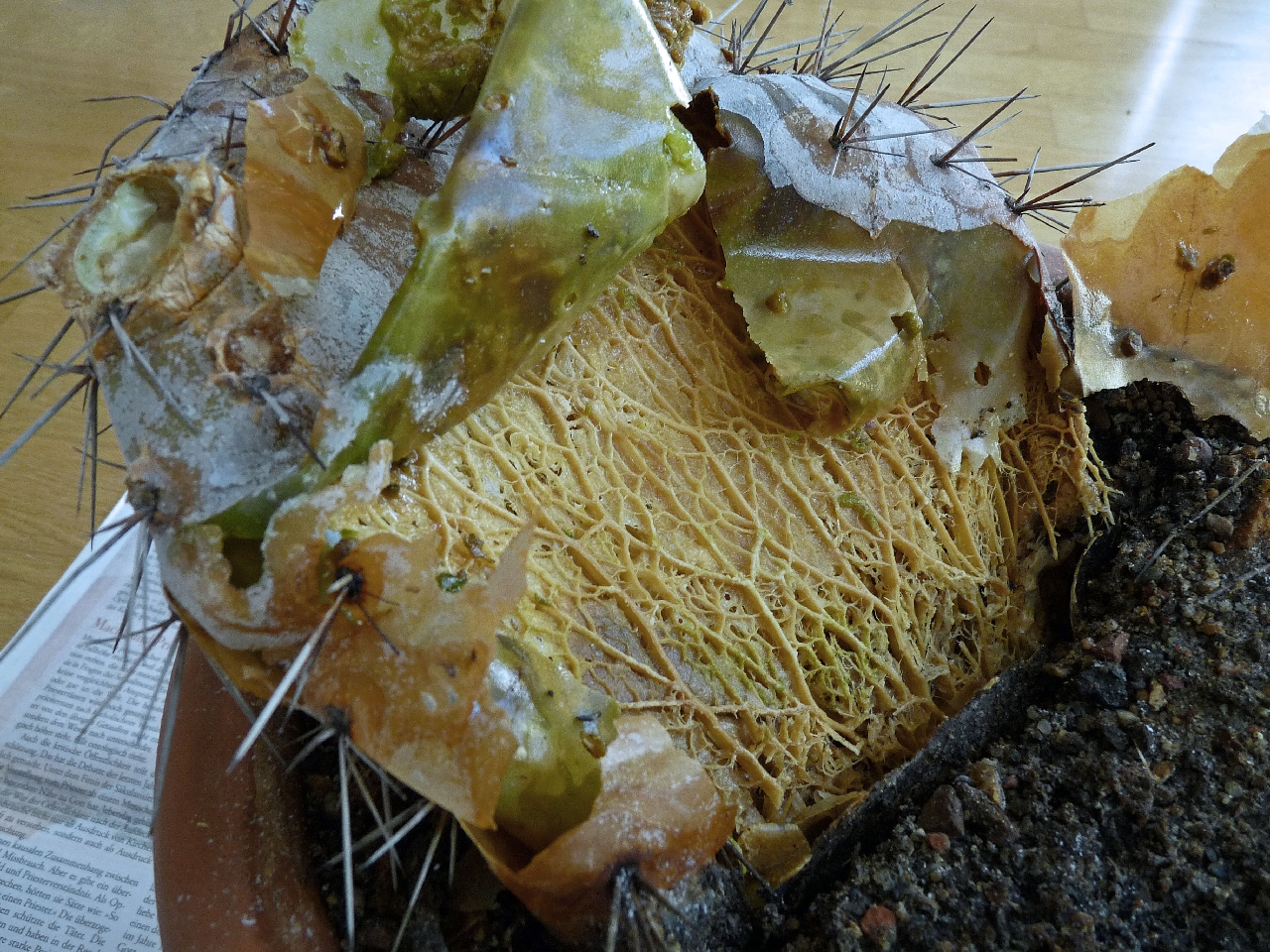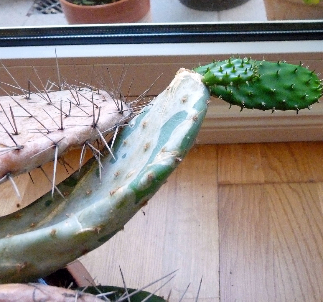 Als ich heute nach Hause kam, bemerkte ich sofort, dass die eine Fensterecke irgendwie anders aussah als sonst. Meine große Opuntia robusta ist regelrecht zusammengebrochen!