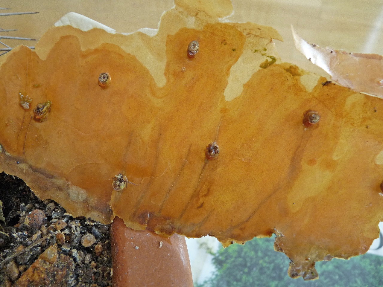 Als ich heute nach Hause kam, bemerkte ich sofort, dass die eine Fensterecke irgendwie anders aussah als sonst. Meine große Opuntia robusta ist regelrecht zusammengebrochen!
