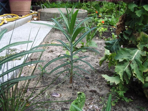sieht mir nach Euphorbia aus, eventuell Euphorbia lathyris (Kreuzblättrige Wolfsmilch), wenn Blätter gegenständig (aus dieser Perspektive schwer zu erkennen.