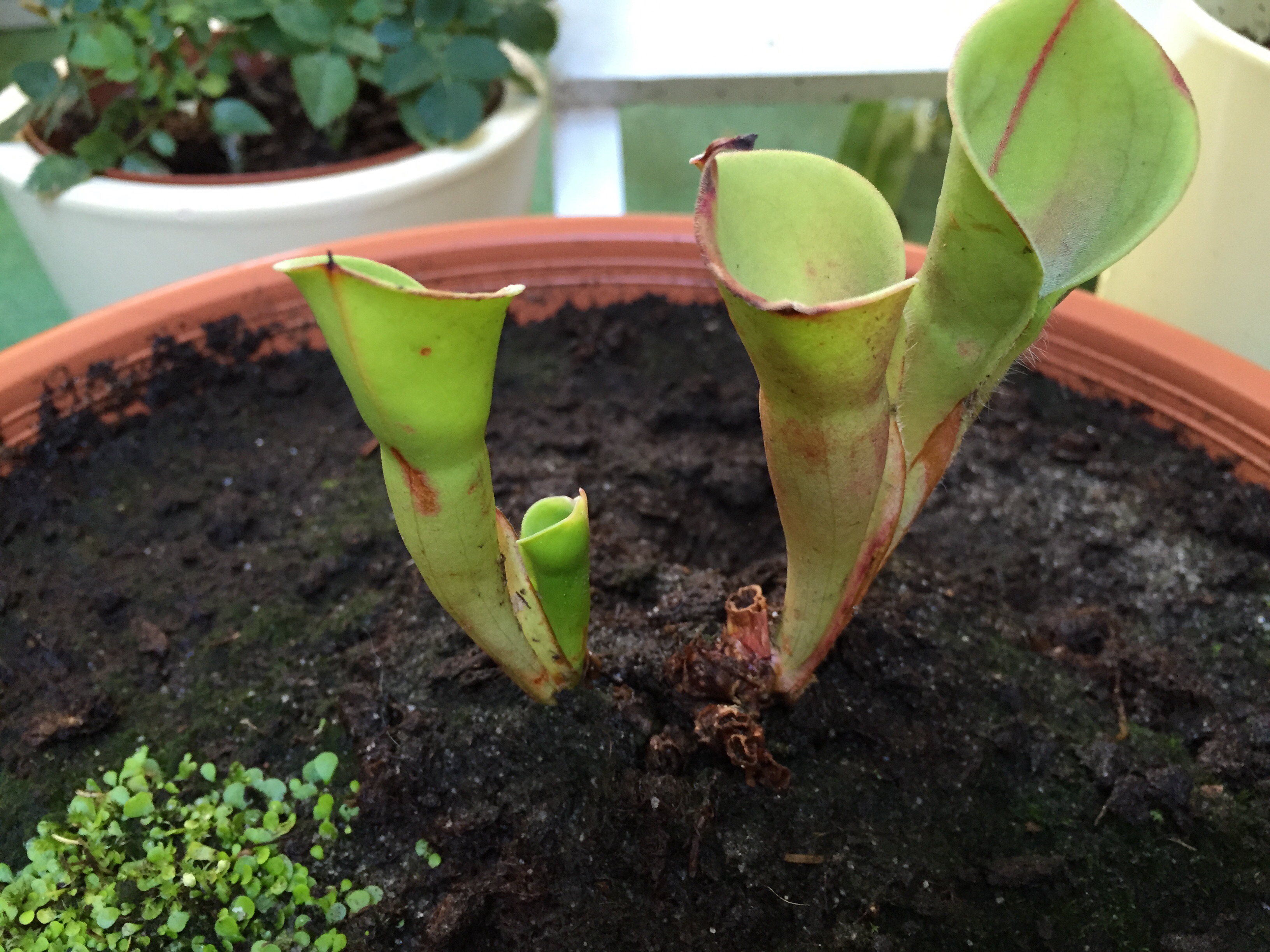 Die Venusfliegenfalle hat einen Ableger, voll süß die kleinen Fallen. Zudem hab ich noch Samen von ihr ausgesät, mal schauen, was das wird. Der Sumpfkrug bekommt einen neuen Krug. Meine Nepenthes Stecklinge sind im Wasserglas nun auch endlich gewurzelt. Und auf meinen Rosetten Droseras war morgens ein Schmetterling. Hatte ihn befreit, er hatte ewig auf meinem Balkon gesessen, mit den Flügeln geschlagen und sich unter die Dachrinne verzogen, kam nach zwei Tagen Regen dann wieder hervor und war dann am nächsten Tag weg und hab ihn auch nicht mehr gefunden irgendwo. Ich hoffe, er ist wirklich weggeflogen und hat sich erholt.