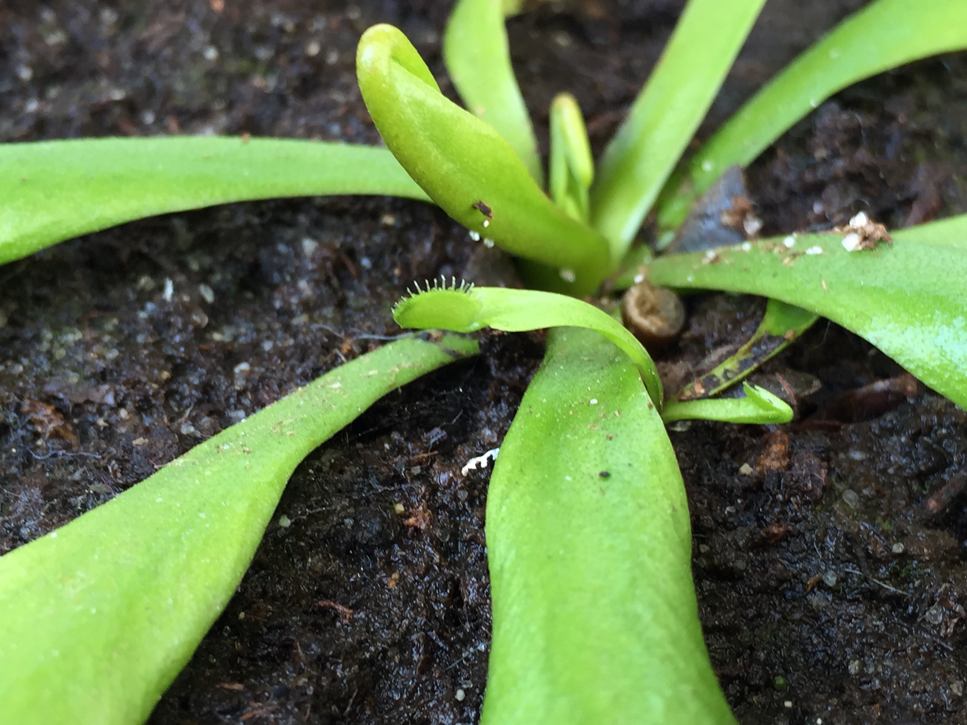 Hehe, man sieht richtig bei der blockierten Falle, die sich nicht richtig schließen kann, wie sich da Fäden ziehen von irgendeinem Sekret.