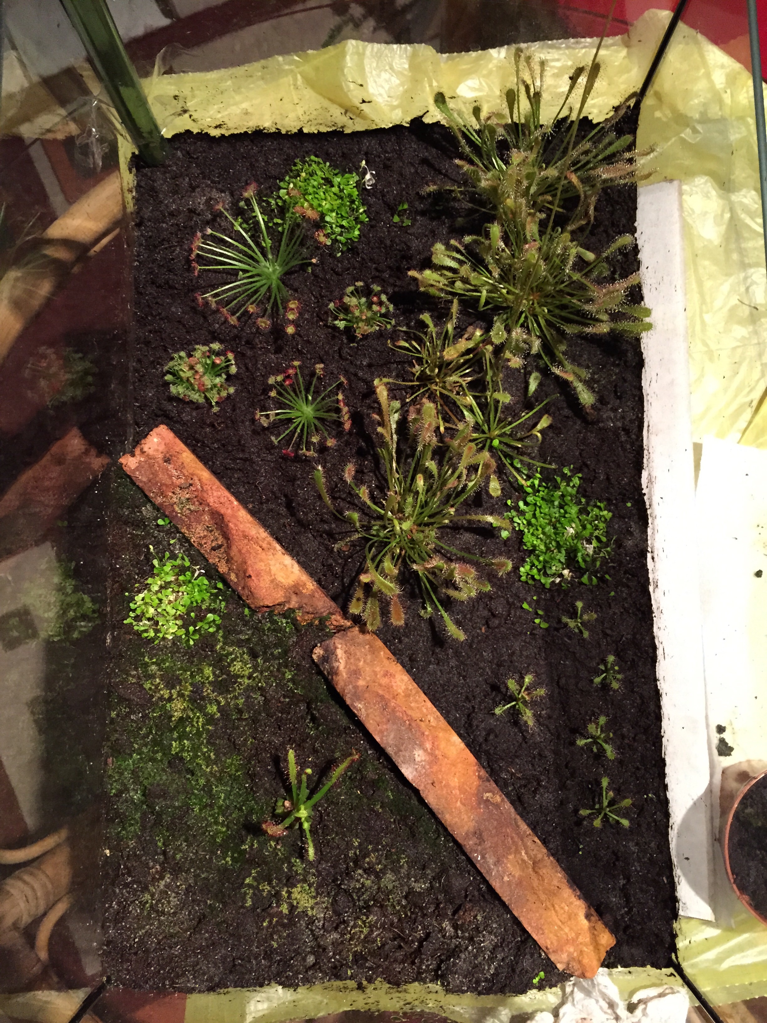 Ich hab mir für meinen winterharten Balkonkasten noch eine D. anglica und eine Hybride aus D. intermedia und rotundifolia geholt und eine D. pradoxa. Für die bzw. das Terra besorg ich mir noch eine Beleuchtung für den Winter. Hab sie erst noch geteilt, bevor sie ins Terra kam, weil sie aus mehreren Ablegern bestand.