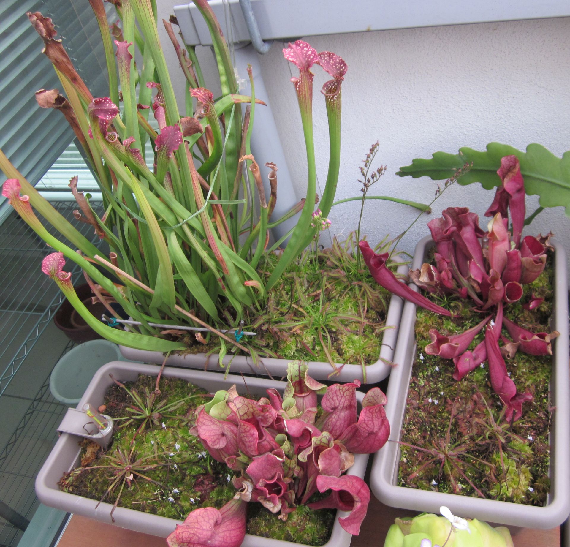 Das sind meine ältesten Kästen, die große Sarracenia nimmt nun den halben Kasten ein, muß ich nächstes Frühjahr wohl mal teilen. Ansonsten sind da noch verschiedene Droserien und Utricularia dabei.