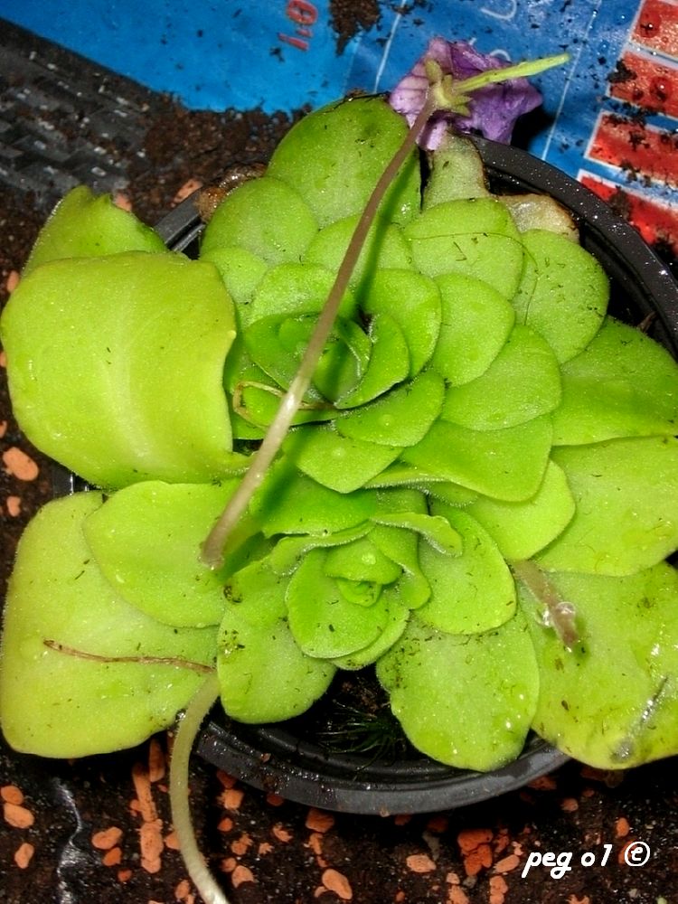 das ist eine Pinguicula-Hybride, vermutlich anhand der Blütenfarbe eine x tina. Kultur, so wie alle mexikanischen Pinguicula: in der warmen Jahreszeit hell, keine bzw. wenig direkte Sonne und im Anstau mit Regenwasser/destilliertem Wasser gießen. Es tut ihr auch nichts, ab und zu normales Leitungswasser zu nehmen. In der kalten Jahreszeit legen diese Pinguicula eine Ruheperiode ein. Dann nicht mehr im Anstau gießen, sondern nur alle 8-10 Tage etwas Wasser in den Unterteller geben. Das Substrat kann ruhig antrocknen. Temperatur während der Ruheperiode: zwischen 5 und 10 Grad. Man kann diese Hybride auch durchkultivieren. Das geht allerdings auf Kraft und Blühfreude.
