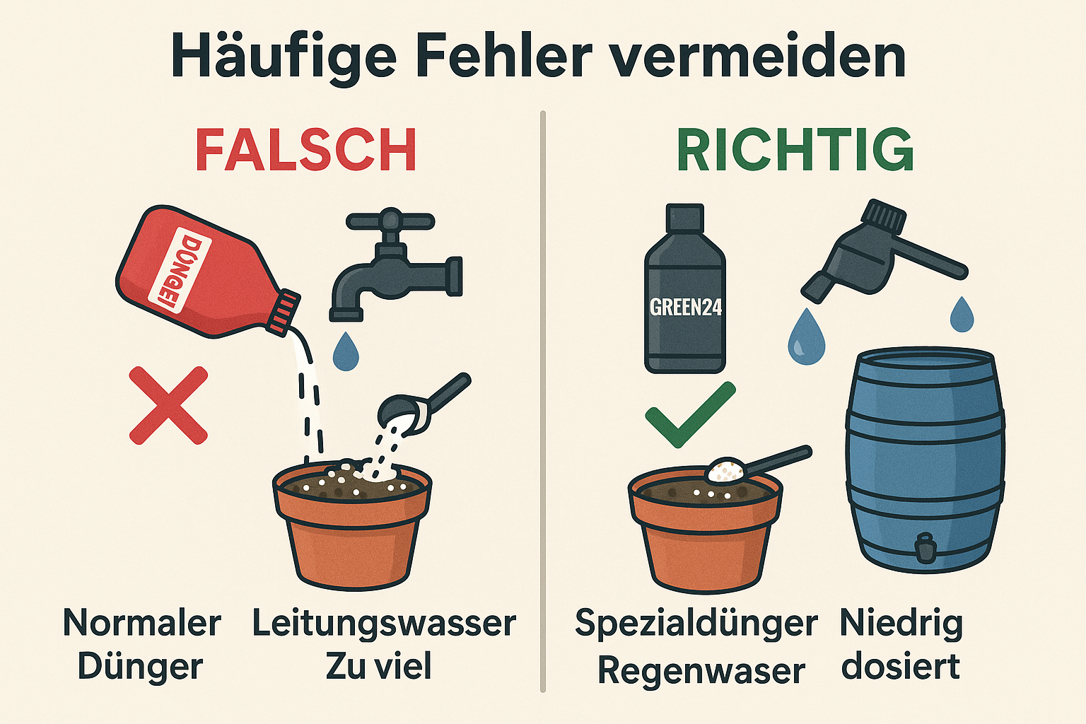 - Verwendung von normalem Blumen- oder Universaldünger: Der häufigste und fatalste Fehler. Diese Dünger sind viel zu hoch konzentriert und salzhaltig. Lösung: Verwenden Sie ausschließlich einen Spezialdünger für Karnivoren wie den GREEN24 Karnivoren-Dünger, der eine extrem niedrige Salzkonzentration und eine angepasste NPK-Formel aufweist.