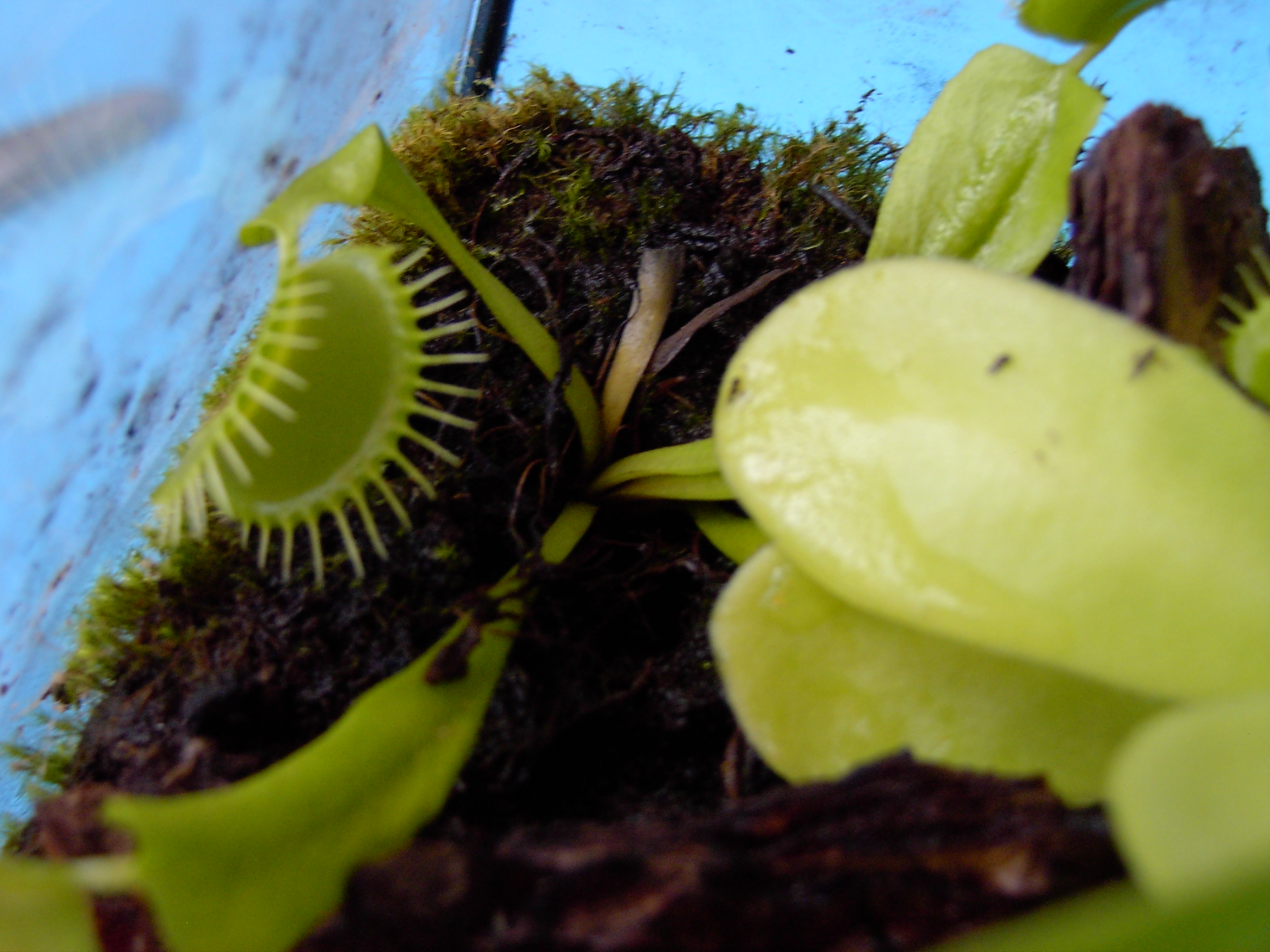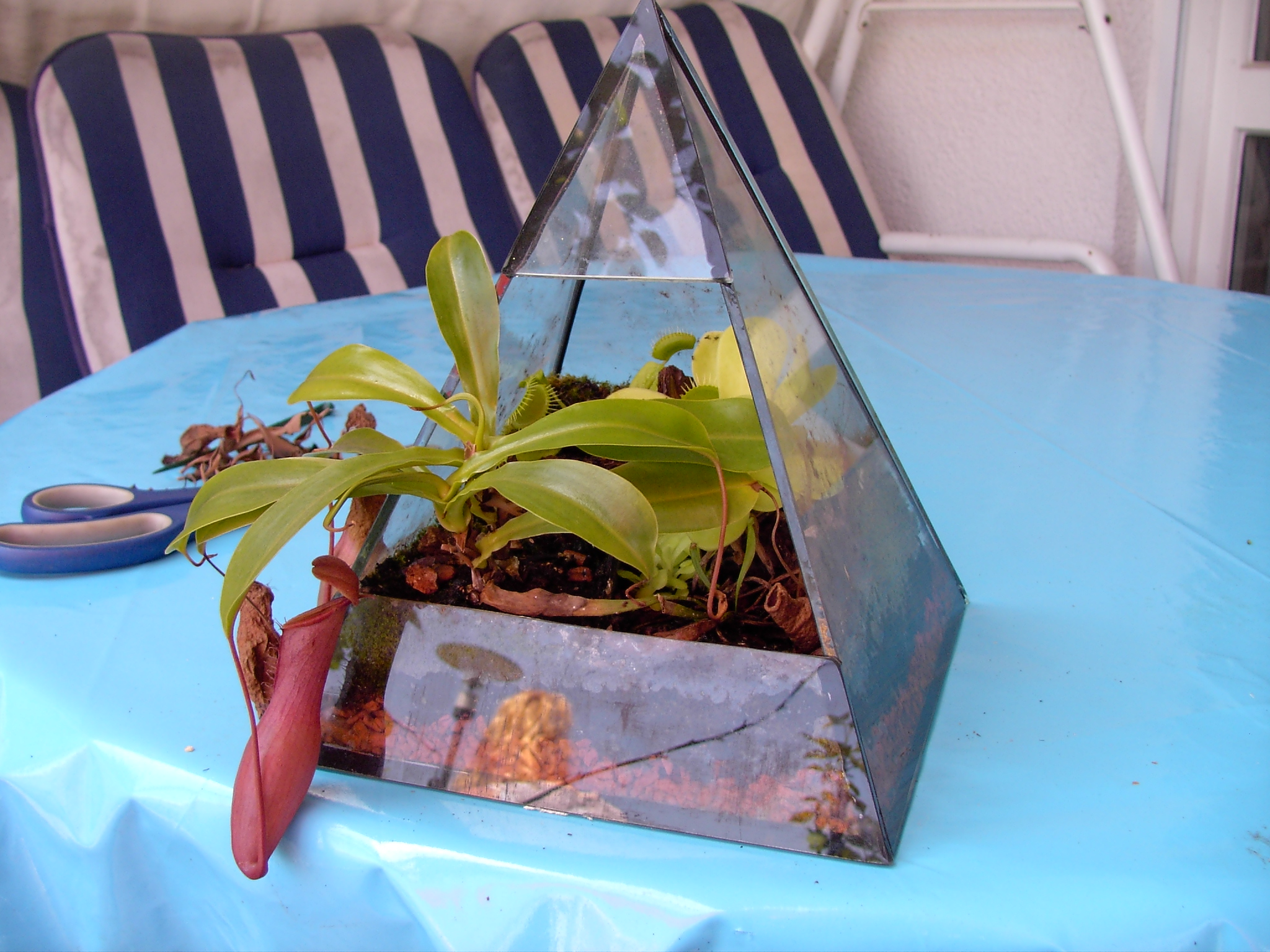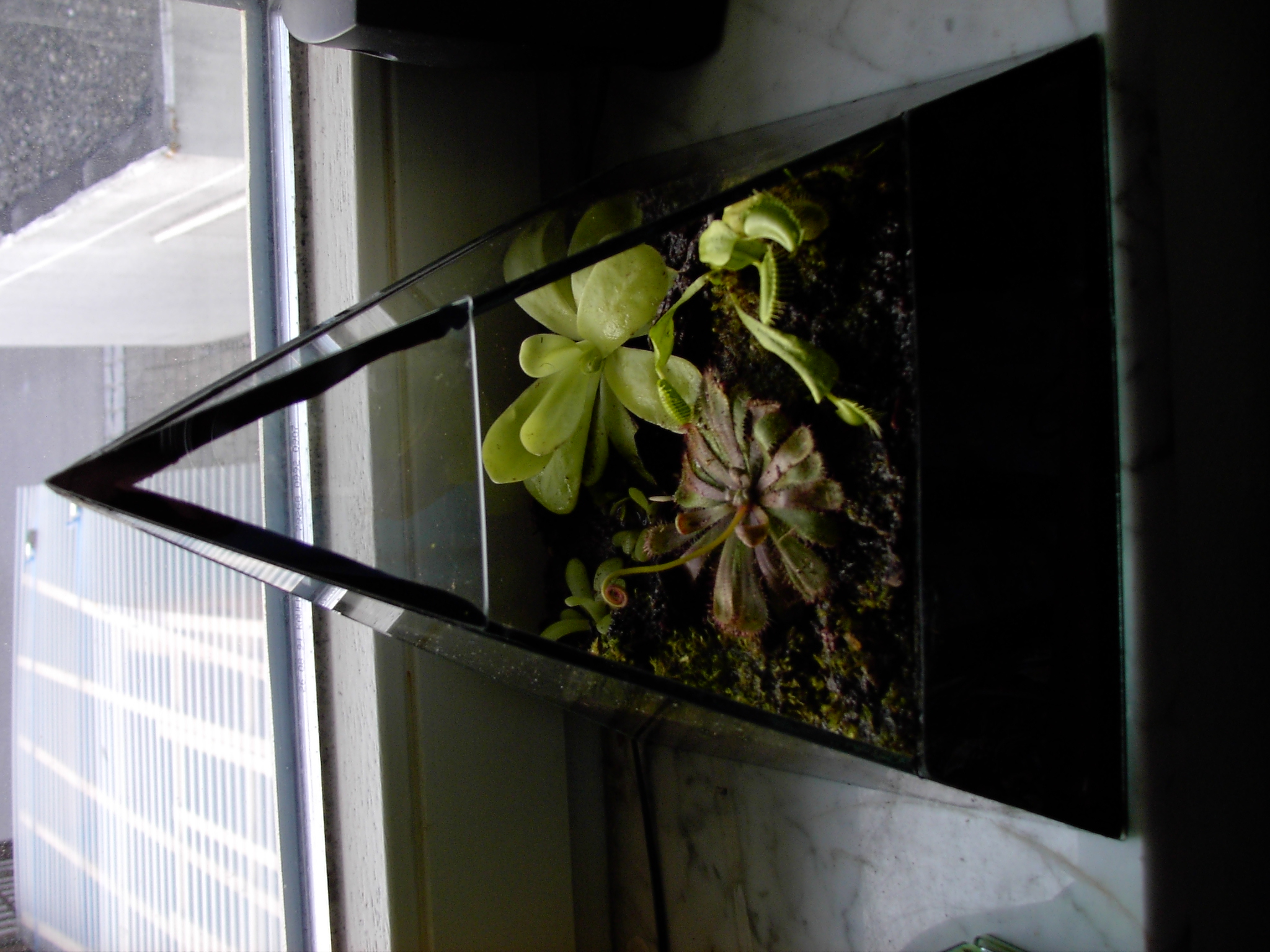 Aber jetzt zu der Pyramide. Also, die Kannenpflanze ist eine Nepenthes ventricosa x alata (ventrata). Die Venus ist ja klar: Dionaea muscipula. Das Fettkraut... naja, ich tippe auf Pinguicula esseriana. Und die arme Sarracenia kann ich leider nicht bestimmen, tippe aber auf einen Hybriden, ähnlich wie `Soper´.