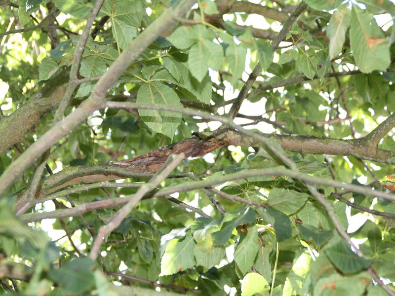 Man betrachte die Risse im gehölz an vielen stellen diese Pilzartigen ablagerungen am Stamm und vereinzeln Welke Blätter.