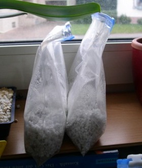 Zur Zeit habe ich neben den Musas, die ja schon seit Mai da stehen, nur meine Amorphophallus und Verwandte in Keimbeuteln. Mit Perlite und auf der Fensterbank am Nordfenster. Die Fensterbank ist nur ein Laminatbrett (selbstgebastelt) über der Heizung, ca 25cm Abstand.
