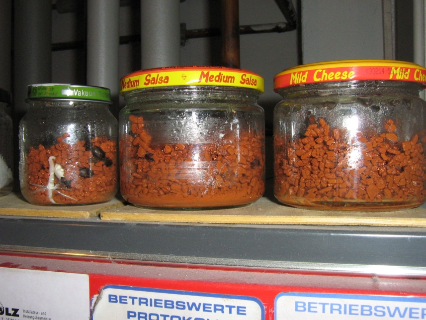 Keimbeutel in der Wohnung zu verteilen wäre zwar eine Möglichkeit gewesen, hätte aber vermutlich die Leidensfähigkeit der übrigen Familienmitglieder überfordert. Ich habe dann einfach Seramis in kleine Konservengläser verteilt und die großen Samen (div. Palmen, Rhizinus und irgendwelche Bäume) dazugegeben. Die Gläser kamen dann im Heizungskeller auf die Heizung bei ziemlich konstanten 26 - 27°C. Das war am 19.03.07. Viel Hoffnung hatte ich bei den uralten Samen ohnehin nicht und mit jeder Woche wurde die geringer. Trotzdem wurde mindestens alle 2 Tage kontrolliert.