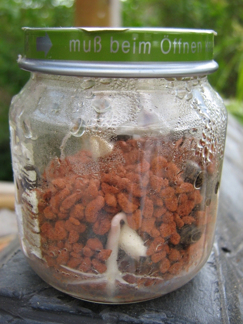 Keimbeutel in der Wohnung zu verteilen wäre zwar eine Möglichkeit gewesen, hätte aber vermutlich die Leidensfähigkeit der übrigen Familienmitglieder überfordert. Ich habe dann einfach Seramis in kleine Konservengläser verteilt und die großen Samen (div. Palmen, Rhizinus und irgendwelche Bäume) dazugegeben. Die Gläser kamen dann im Heizungskeller auf die Heizung bei ziemlich konstanten 26 - 27°C. Das war am 19.03.07. Viel Hoffnung hatte ich bei den uralten Samen ohnehin nicht und mit jeder Woche wurde die geringer. Trotzdem wurde mindestens alle 2 Tage kontrolliert.