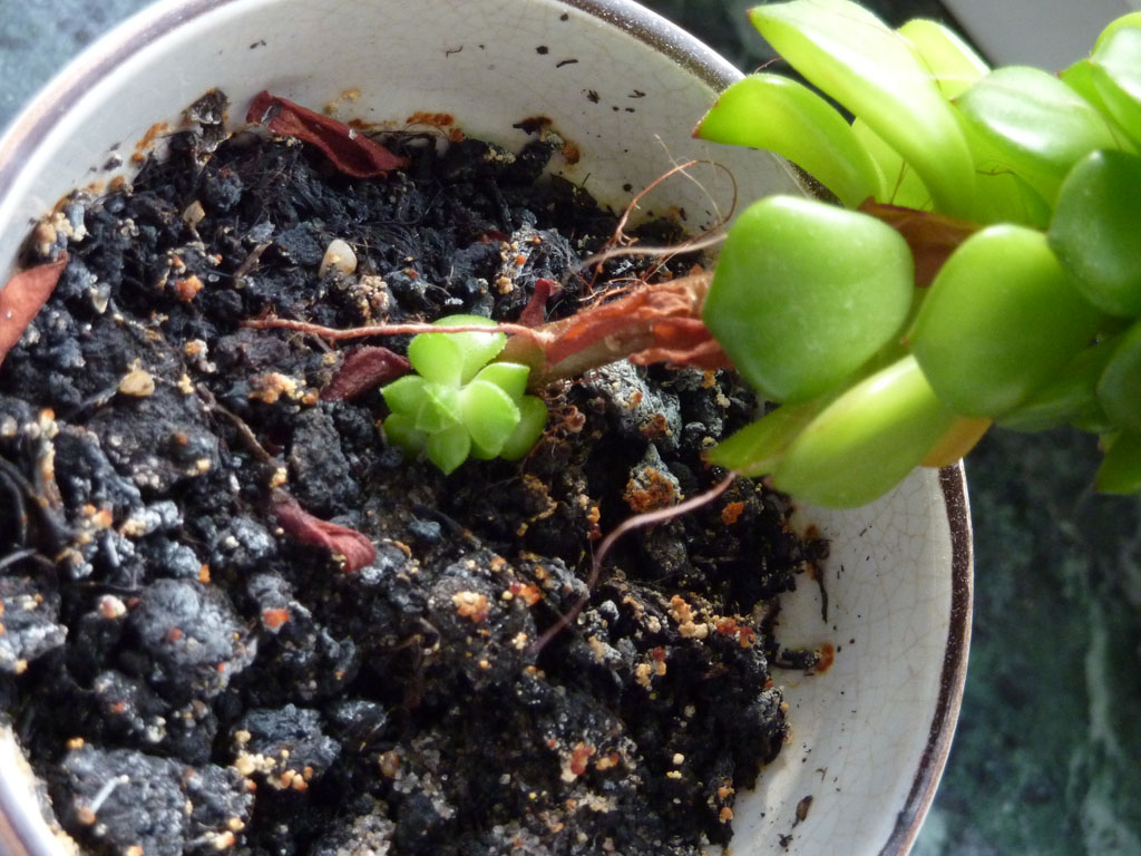 Du könntest im März die Pflanze halbieren und das obere Stück in trockene Kakteenerde stecken. Sie zeigt dort ja jetzt schon Wurzeln. Nach ca. 8 Wochen ist sie so bewurzelt, das sie dann wieder in ihren normalen Giess-Rhytmus kann. Das untere Stück lässt Du so und hast dann noch eine Zweite Pflanze, weil sie ja schon von dort verzweigt. Du kannst sie natürlich auch beide in einen Topf stecken, dann sieht sie bald so aus wie meine. Günstig wäre dann die Pflege so, wie ich sie beschrieben habe.