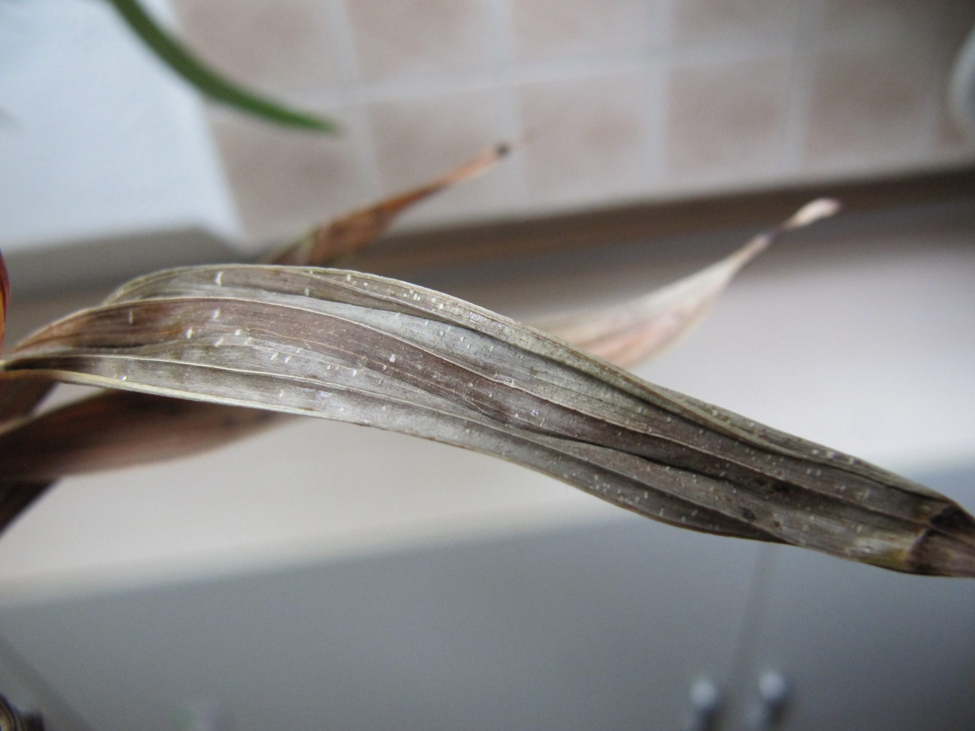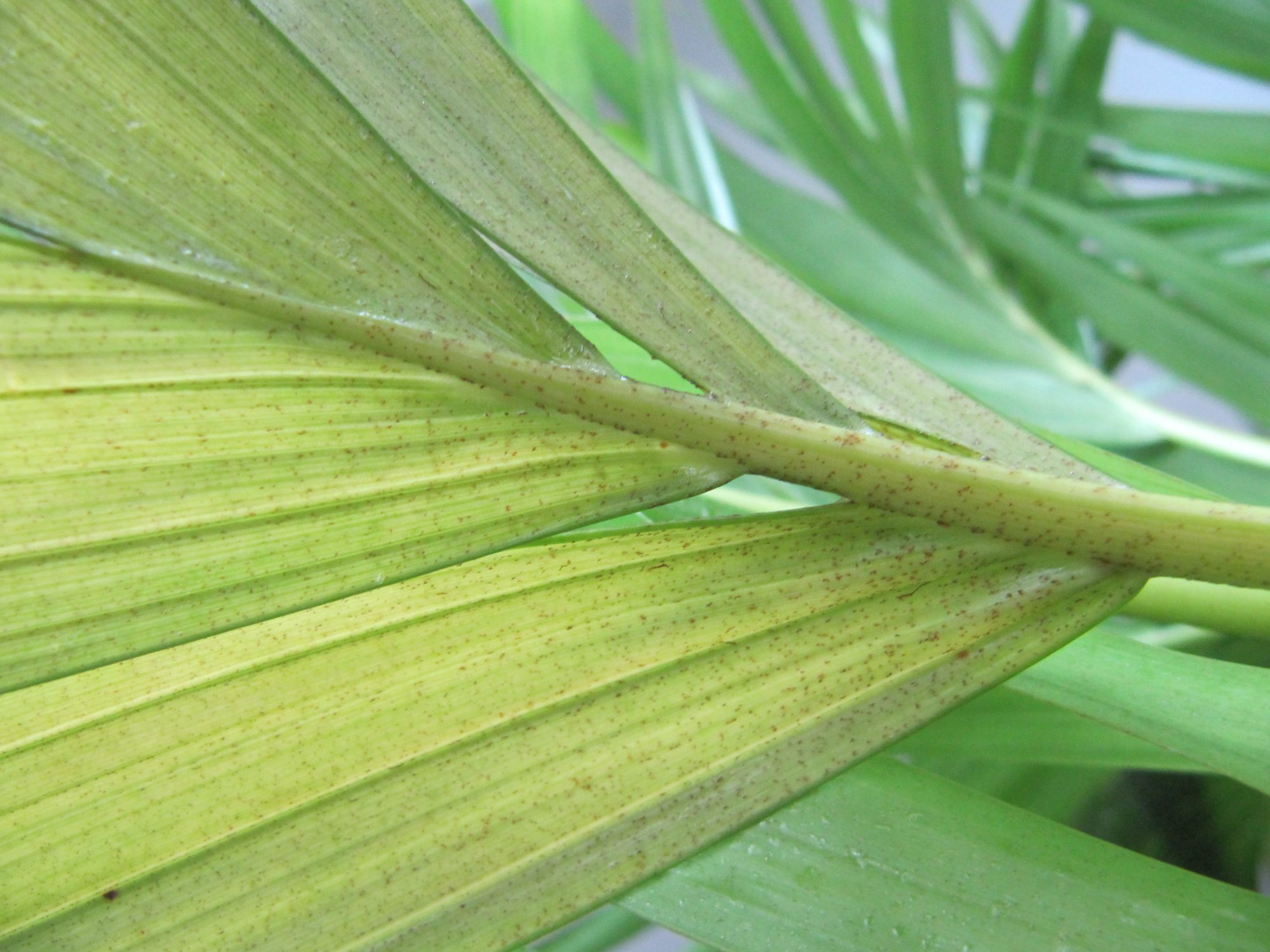 Problem 1: Auf der Unterseite der Wedel und an den Stämmen (nennt man das so?) sind kleine braune Punkte, vor allem da, wo die Blätter vom Stamm abgehen. Sie sind nicht Teil der Pflanze und lassen sich abwischen/kratzen, deshalb glaube ich, dass es sich um Milben handelt. Die Wedel, an denen mehr dieser "Punkte" sind, sind gelblich und gehen langsam ein (Foto). Die Punkte sind so klein, dass ich nicht erkennen kann ob sie Beine haben oder sonstiges, also wirklich winzig. Ich habe versucht sie zu fotografieren, die Beweisbilder hänge ich an! Ich habe im Internet gesehen, dass Spinnmilben kleine weiße Saugstellen hinterlassen, deshalb habe ich danach Ausschau gehalten - nicht sonderlich erfolgreich. Es gibt einen komplett vertrockneten Wedel, an dem kleine weiße Flecken an den Spitzen sind, sonst nirgendwo. Außerdem habe ich die Pflanze eingesprüht und keine Anzeichen für Netze oder sonstiges gefunden.