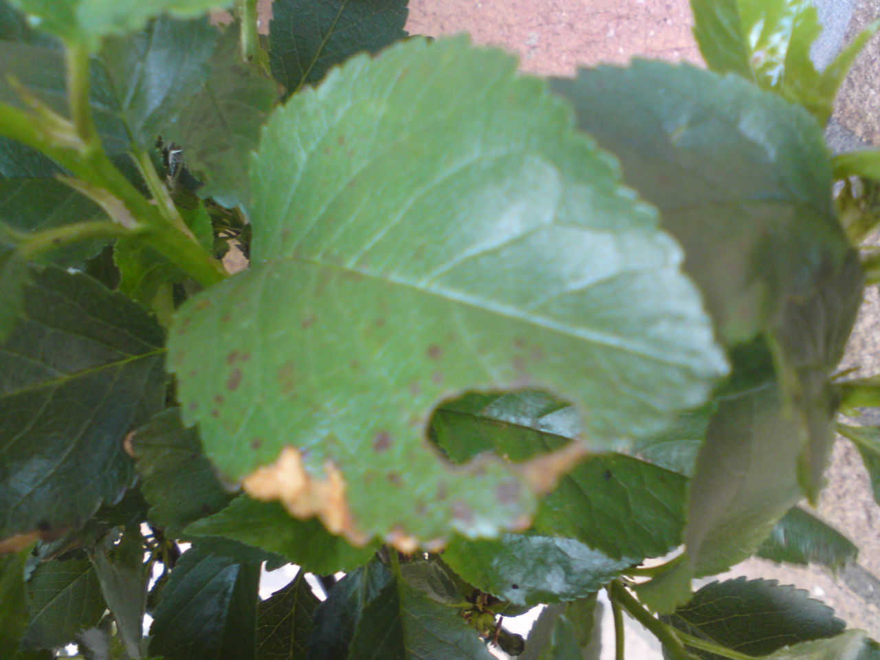 der hat irgentwie so braune punkte und die spitzen sind ganz braun und durchlöchert sind die blätter auch ...