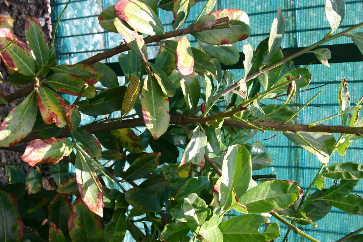Unser neugepflanzter Kirschloorbeer sieht ähnlich ramponiert aus. Diagnose des Gartencenters: Pilz, Blattlaus, Sonnenbrand...