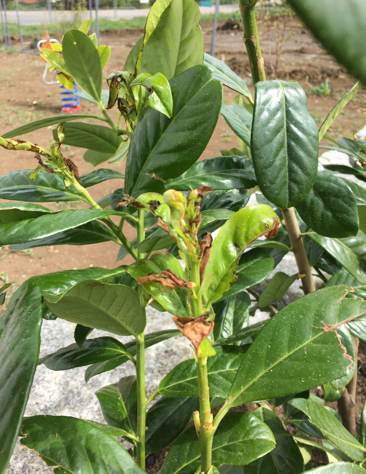 vor rund 5 Wochen habe ich eine kleine Kirschlorbeerhecke (Novita) gepflanzt. Höhe ca. 80-100cm, Topfware. Wie von der Gärtnerei empfohlen, habe ich nach einigen Tagen (bei bewölktem und trockenen Wetter) die unverzweigten (Haupt-)Triebe etwas eingekürzt.