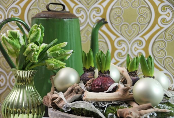 Doch wenn Sie genug haben von all dem Trubel, dem hektischen Treiben, von überfüllten Kaufhäusern, rummeligen Weihnachtsmärkten und übellaunigen Passanten, dann sehnen Sie sich nach Hause, in Ihre Wohnung, in der Sie längst mit Kissen, Kerzen, Kugeln und Kuscheldecken für festliche Adventsstimmung gesorgt haben. Doch auch wenn Ihnen die Natur draußen die kalte Schulter zeigt, müssen Sie nicht auf Ihre Blütenschätze verzichten. Zwiebelblumen im Topf wie Hyazinthen, Amaryllis und Tulpen sind jetzt schon im Handel und eignen sich hervorragend für festliche Inszenierungen. Mit Kreativität und Fantasie können Sie Ihre unbändige Dekorationslust stillen. Kombiniert mit glänzenden Kugeln, feinem Engelshaar, Teelichtern oder anderen Accessoires lassen sich Festtagslandschaften auch auf kleinstem Raum gestalten. Ob auf der Anrichte, dem Beistell-, Küchen-, Wasch- oder Nachttisch, überall versprühen Zwiebelblüher ihren rührenden Charme und bringen zugleich die Anmut und den Duft der Natur ins Haus.