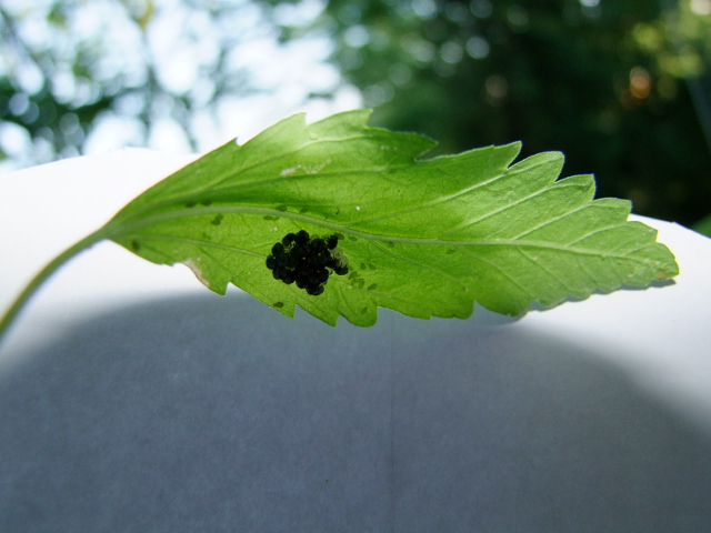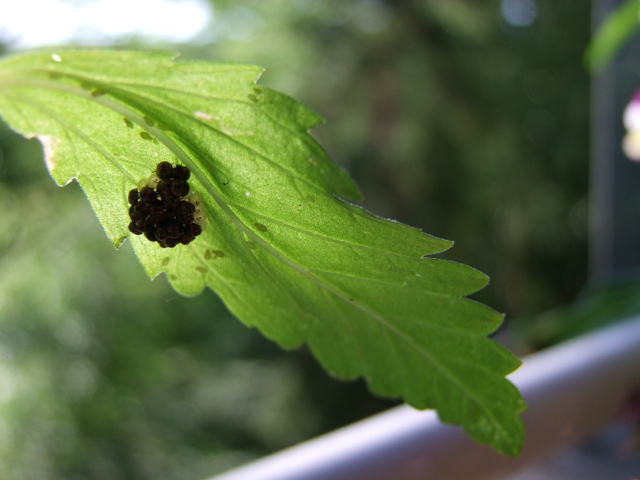 also diese hellgrünen, runden Eier, die so ganz in Reih und Glied unterm Hibiscus-Blatt waren, haben wir mal schlüpfen lassen (in einem Glas), sie waren schwarz und hatten 6 Beinchen, die Eihüllen wurden dann weiß.