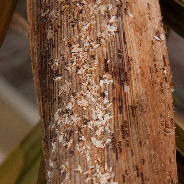 Ausprobiert habe ich Sticks aus dem Baumarkt, die man in die Erde steckt und die u.a. auch gegen Wollläuse wirken. Dann habe ich die Pflanze mit einem speziellen Spray gegen Schädlinge besprüht nur bei der großen Öberfläche der Palme findet sich irgendwie immer eine Stelle ohne Schutzfilm, so dass sich die kleinen weißen Raupen dort einnisten. Ich weiß nicht, ob es sich dabei um Raupen handelt. Sie sind ca. 1-2mm lang und bewegen sich eigentlich nicht.