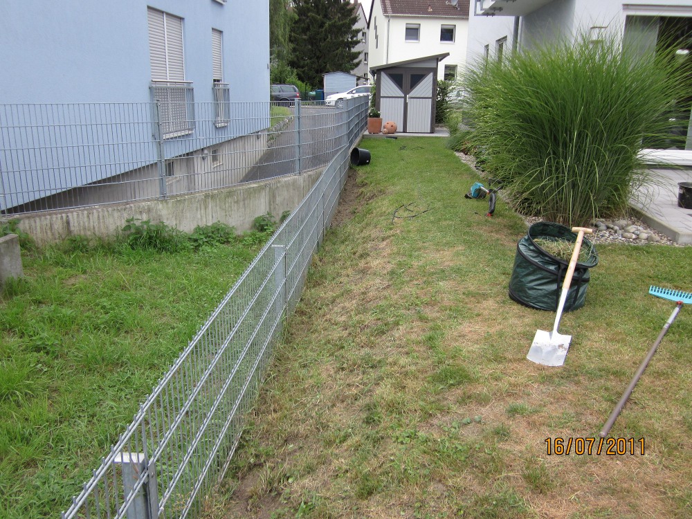 Auf dem Foto ist links ein Mattenzaun, zu dem das Gelände abfällt. Ich möchte nun direkt am Mattenzaun (im Abstand von ca. 10cm) Hangsteine setzen, so dass das Niveau des Geländes rechts im Bild (mit dem Grasbeet) erreicht ist, dann den entstehende Graben auffüllen, so dass hier eine ebene Fläche entsteht. Darauf soll dann evtl. eine Hecke gesetzt werden.