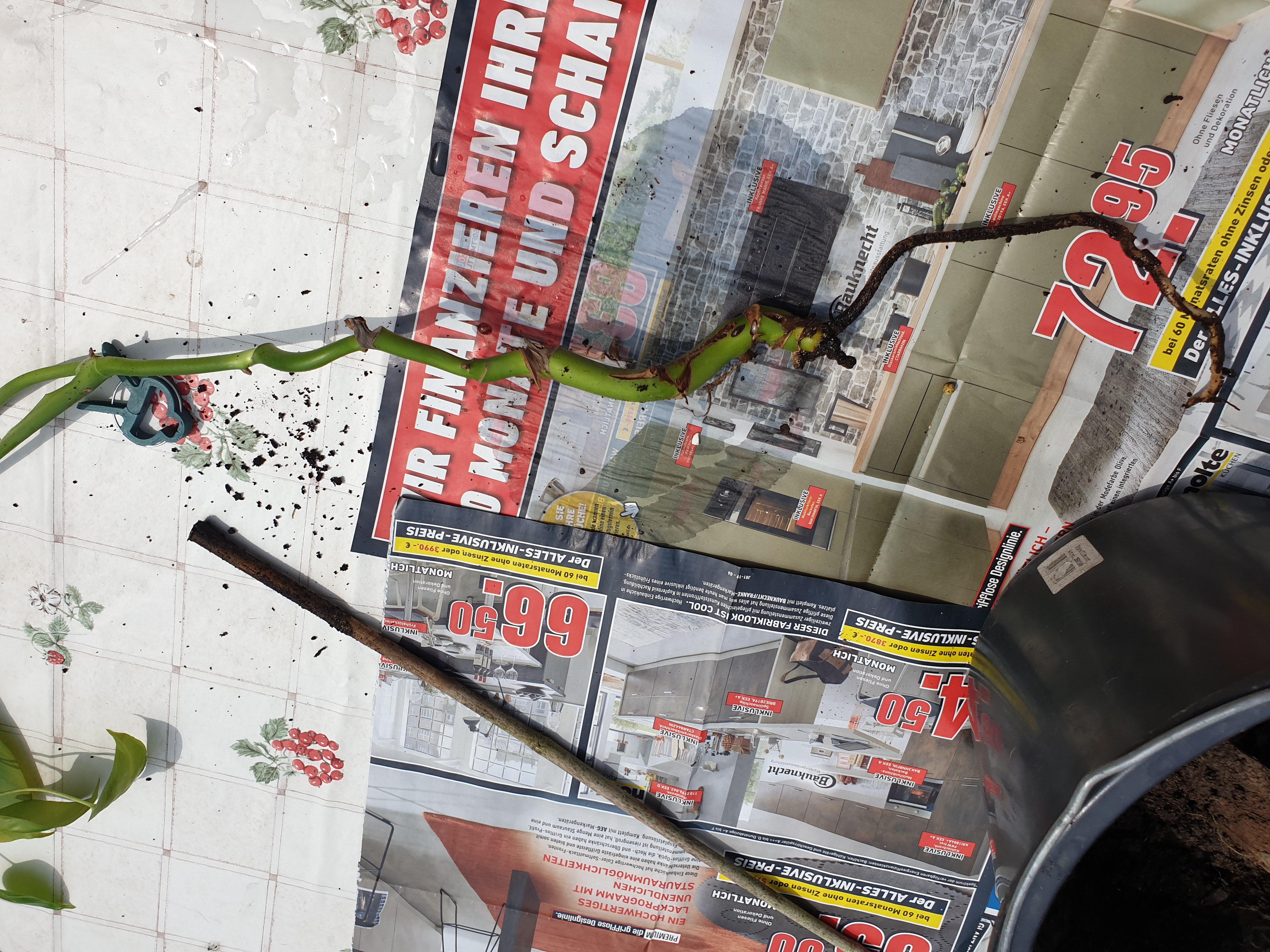 Als ich die Pflanze bekommen habe war das Substrat auch komplett nass und nicht mehr schön, weswegen ich die Monstera sofort umgetopft habe. Dabei habe ich gesehen, dass ihr Leben nur noch ein einer einizgen Wurzel hängt, der Rest ist abgestorben.