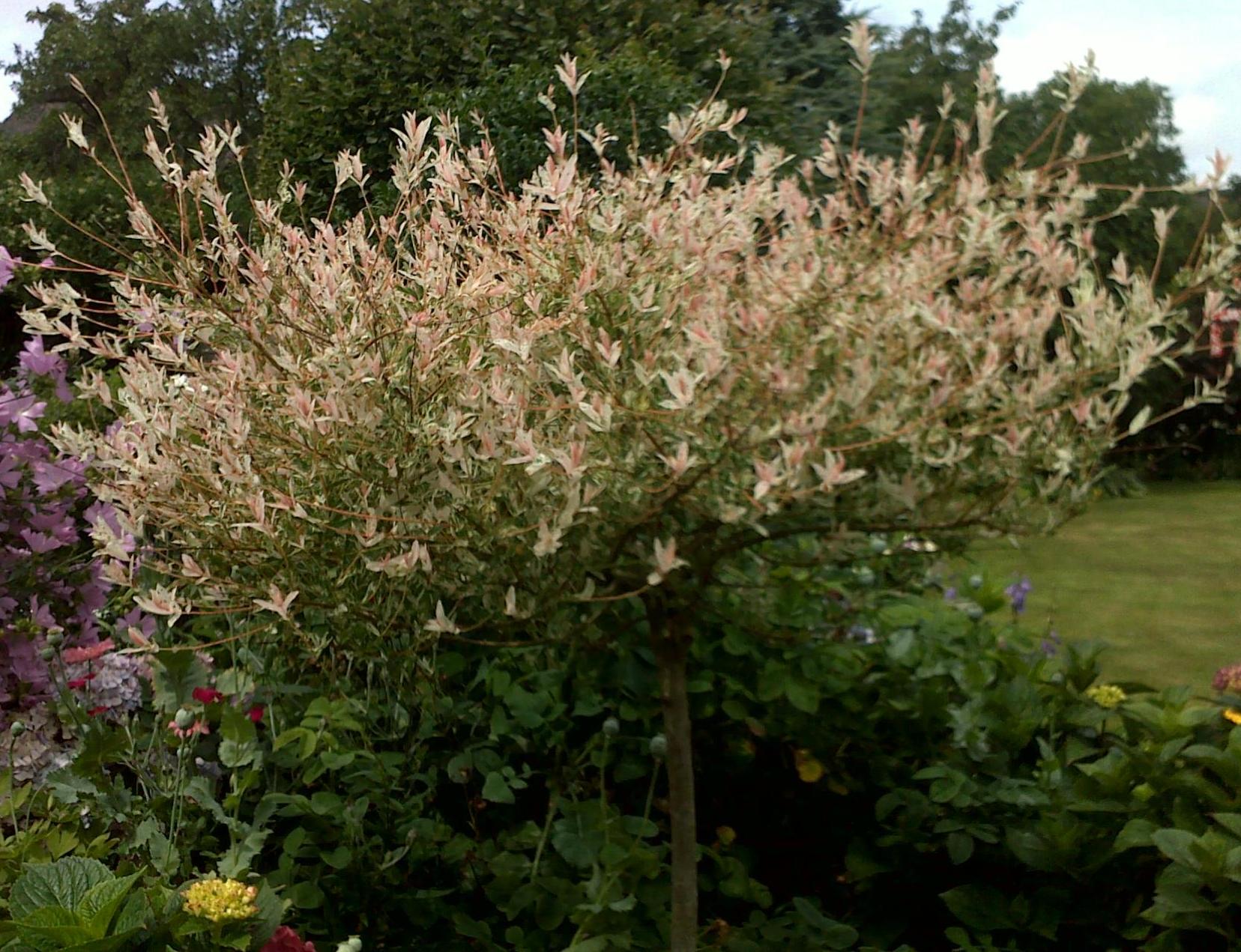 Dein Bäumchen ist eine buntlaubige Weide auch Harlekin-Weide genannt, als Hochstämmchen: