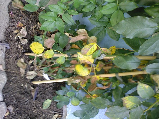 Die Rose dürfte vom Sternrußtau befallen sein. Das ist eine fiese Pilzkrankheit, die leider immer wieder kommt. Du müßtest alle befallenen Blätter entfernen und mit einem Mittel spritzen, dann nach ein paar Wochen noch mal.