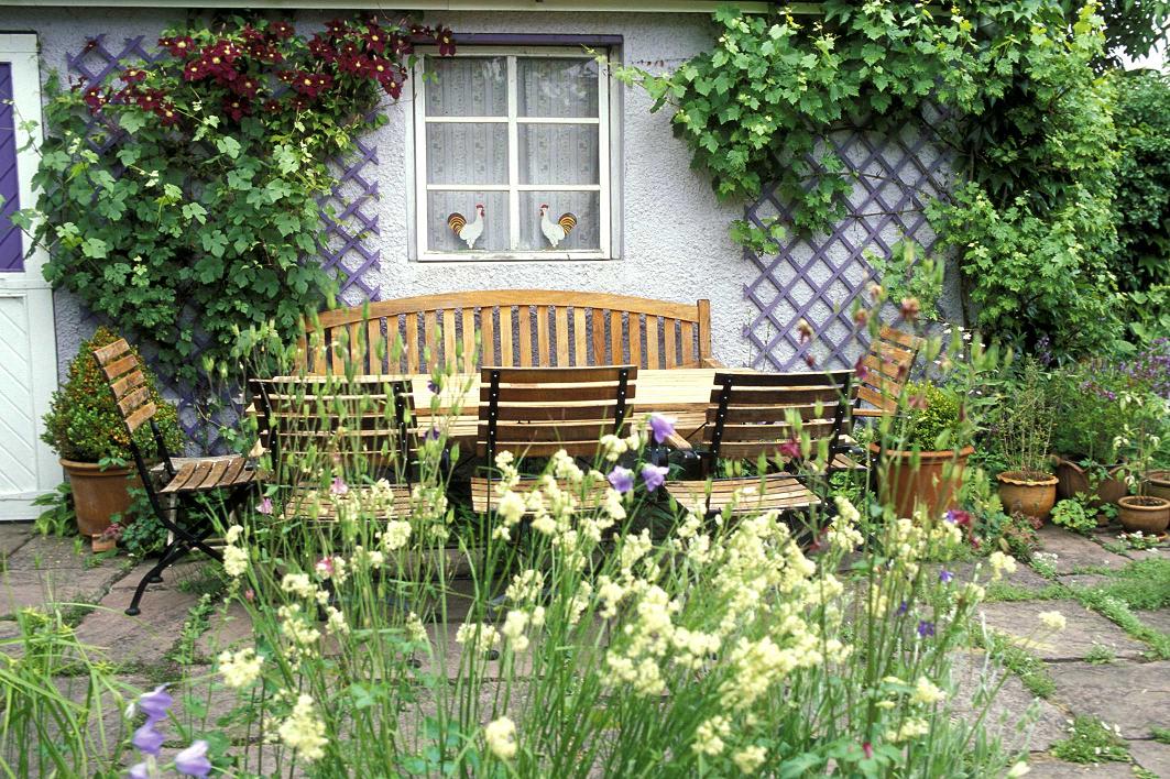 Mit Kletterpflanzen kann man in nur einer Saison die karge Wand auf der Terrasse oder dem Balkon begrünen und so schnell eine behagliche Atmosphäre schaffen. Ohne Kletterhilfe kommen beispielsweise Efeu (Hedera), Wilder Wein (Parthenocissus) oder die Kletter-Hortensie (Hydrangea) aus. Diese sogenannten Selbstklimmer klettern mit ihren Haftorganen direkt an Pergolen oder Wänden empor. Ist der Putz jedoch schon älter, können die Wurzeln hier Schäden verursachen. Unkomplizierter zeigen sich Pflanzen, die auf eine Aufstiegshilfe angewiesen sind, wie beispielsweise Clematis, Geißblatt (Lonicera) oder Knöterich (Fallopia) sowie fast alle einjährigen Kletterkünstler. Alle benötigen Konstruktionen wie Drahtgitter, Seilsysteme oder Holzspaliere, um in die Höhe zu wachsen und lassen sich so gezielt im Wuchs kontrollieren und lenken. Mit einem individuellen Gerüst lässt sich die Pflanze zu einem grünen Sicht-, Wind- und Sonnenschutz formen. Für einjährige Gewächse eignen sich besonders natürliche Materialien wie Weidenruten, Bambusstäbe oder Schnüre aus Jute, die nach der Vegetationszeit einfach mit auf den Kompost wandern.