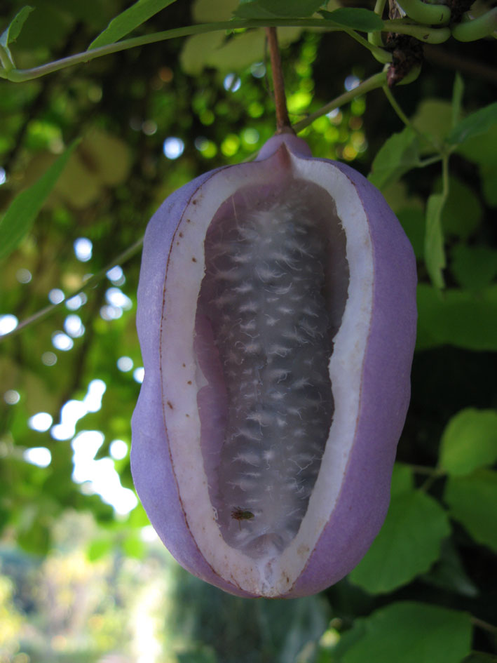 Der "Kokon", falls es denn einer ist, ist ca. 10 cm hoch und hängt von einem Zweig einer Kletterpflanze und er ist von außen helllila. Habe ein Bild beigefügt.