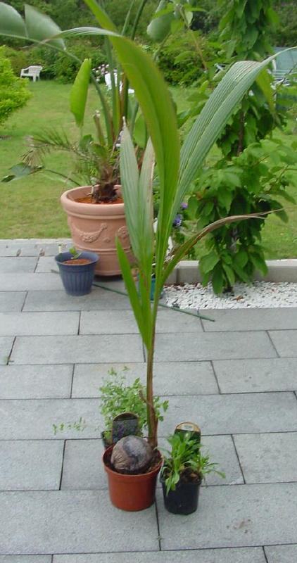 Ich hab noch etwas für euch, weil ich glaube dass wenn man ihr das ideale Klima schafft dass man sie dann über Jahre hinweg ziehen kann :Wenn Sie Ihr Glück mit einer Cocosnuß probieren wollen, können Sie diese aufgrund er Größe natürlich schlecht in Cocos-Substrat einpacken. Hier empfiehlt es sich, einen ausreichend großen Pflanztopf zur Hälfte mit Cocos-Substrat zu füllen und die Nuß mit einer schraubenförmigen Bewegung hineinzudrücken. Cocosnüsse besitzen wie viele andere Palmensamen 3 Austrittsöffnungen, die wie kleine Dellen aussehen. Nur hinter einer der Öffnungen befindet sich der Keim. Wenn man vorsichtig mit einem Schraubendreher o.ä. an diesen 3 Dellen kratzt, wird man eine finden, die anders aussieht als die beiden anderen. Kundige erkennen darin die Rückseite des Fruchtfleisches, das bekanntlich von einer braunen, glatten "Haut" umgeben ist. Die Nuß muß natürlich mit dem Keimaustrittspunkt nach unten in den Topf. Wer will, kann vorher die Cocosnuß einen oder zwei Tage lang in lauwarmem Wasser vorwässern. Über den Pflanztopf mit der Nuß stülpt man dann eine Plastiktüte. Aufgrund der zwar geringen aber doch nicht unerheblichen Verdunstung muß man ab und zu das Substrat erneut anfeuchten. Aber bitte nur leicht feucht halten; bei zuviel Wasser fault die Nuß.