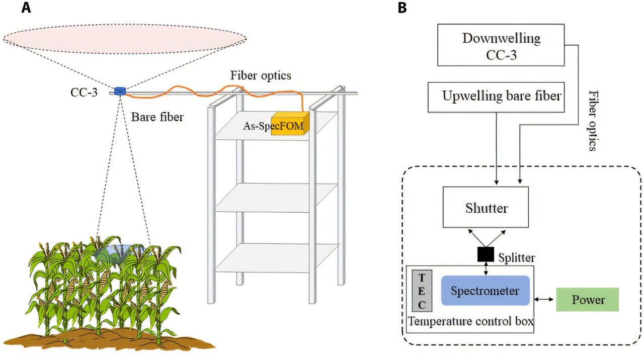 Turmbasiertes automatisiertes SIF-Beobachtungssystem. (A) Schematische Darstellung der Feldinstallation des Vegetationsdach-AS-SpecFOM-Systems. (B) Strukturdiagramm des spektralen Beobachtungssystems. CC-3, Kosinuskorrektur; Verschluss, elektronische Umschalter; TEC, Temperaturkontrollsystem. Bildnachweis: Journal of Remote Sensing (2024). DOI: 10.34133/remotesensing.0369