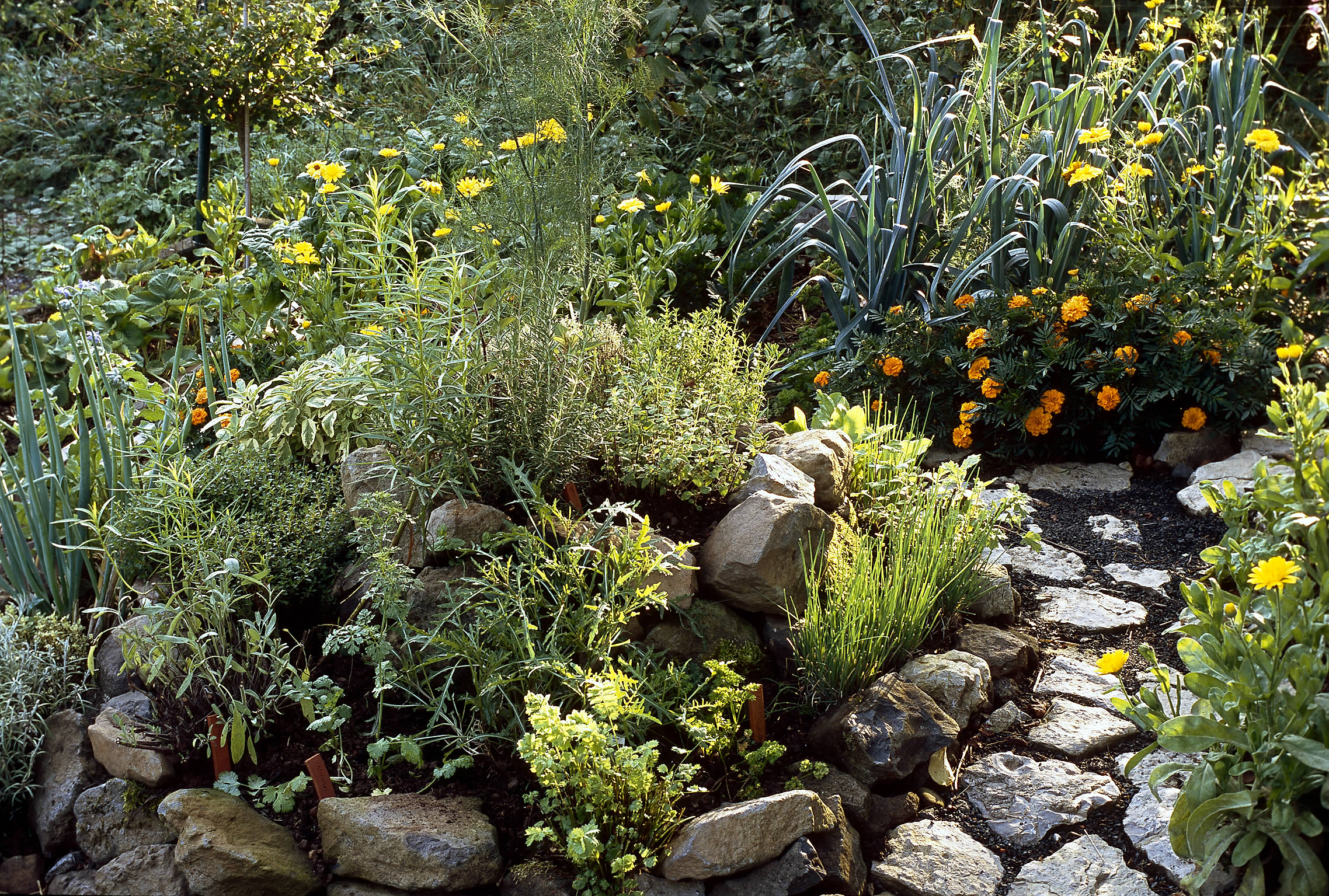 Auch heutzutage können Heil- und Nutzpflanzen den eigenen Garten bereichern. Viele blühende Heilpflanzen ? häufig Stauden, die über mehrere Jahre wachsen und gedeihen ? sind vor allem im Sommer eine echte Zierde. Für einen Klostergarten en miniature braucht man nicht viel Platz. Es reicht ein kleiner Hausgarten, um in seinen Genuss zu kommen. Schon in den traditionellen Klostergärten wusste man, welche Pflanzenkombinationen für eine gesunde Mischkultur geeignet waren. Für den modernen Gärtner lassen sich aus diesen alten Vorbildern bewährte Beetgestaltungen ableiten: Thymian, Salbei (Salvia), Studentenblume (Tagetes) und Ringelblume (Calendula) fanden sich früher bunt gemischt in jedem Klostergarten. Große Kräuter wie Beifuß (Artemisia), Engelwurz (Angelica), Eibisch (Althaea) und Malve (Malva) bilden einen geeigneten Beethintergrund. Die Beetumrandung muss keineswegs immer aus Buchsbaum bestehen, je nach Standort eignen sich dazu auch Lavendel, Heiligenkraut (Santolina), Eberraute oder sogar Duftveilchen (Viola). Einjährige wie Dill und Kerbel passen zum Beispiel hervorragend in ein Gemüsebeet, während wiederum Staudenkräuter wie Estragon, Zitronenmelisse und Frauenmantel (Alchemilla) bestens zwischen Rosensträuchern, Phlox und Pfingstrosen (Paeonia) gedeihen. Neben der Rose standen in den Klostergärten auch die Madonnen- und die Schwertlilie (Iris) als Heilpflanzen hoch im Kurs. Eine bewährte Kombination ist auch intensiv duftender, beruhigender Lavendel und üppig blühende Rosen. Neigt sich der Sommer dem Ende zu, bescheren spätblühende Kräuter wie Königskerzen (Verbascum), Sonnenhut oder Wasserdost (Eupatorium) dem Garten ein farbenfrohes Finale. Mit Gewürz- und Heilpflanzen können aber nicht nur bunt blühende Rabatten, sondern auch sanfte Ton-in-Ton-Pflanzungen gestaltet werden: Blattkräuter in verschiedenen Grüntönen, kombiniert mit abwechslungsreichen Blattstrukturen ? wie zum Beispiel Petersilie, Zitronenmelisse und Pimpinelle ? passen besonders gut in formal gestaltete Gärten.