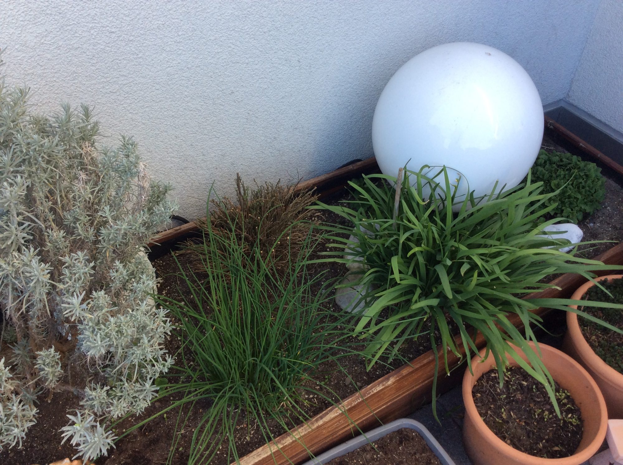 In der anderen Beethälfte herrscht noch ziemlicher Wildwuchs. Den Salbei habe ich stark runtergeschnitten und hoffe, dass er kräftig neu austreibt und wieder schöner wird. Oregano tut noch nicht viel, genauso wie Thymian, bei dem ich noch auf Austrieb warte, bevor ich auch ihn stark schneiden möchte. Den riesigen Rosmarin hatte ich schon letztes Jahr halb erfolgreich sehr stark verkleinert, und nun ist im Februar auch noch ein Teil Opfer einer Dachlawine geworden und abgebrochen. Da werde ich auch noch mit der Schere oder sogar Säge eingreifen müssen, um ihn wieder in eine präsentierbare Form zu bekommen, aber klein ist er auf jeden Fall wieder.