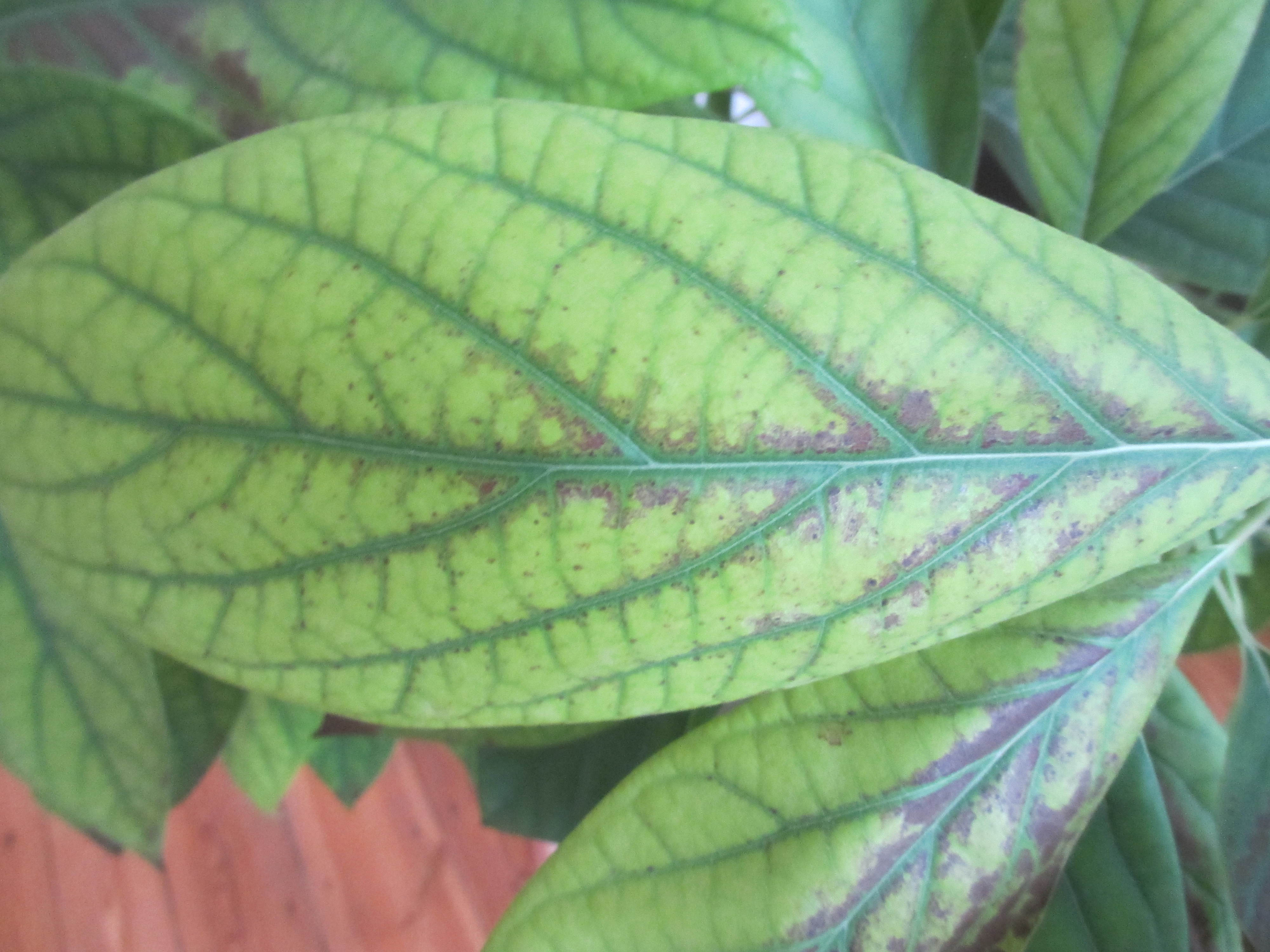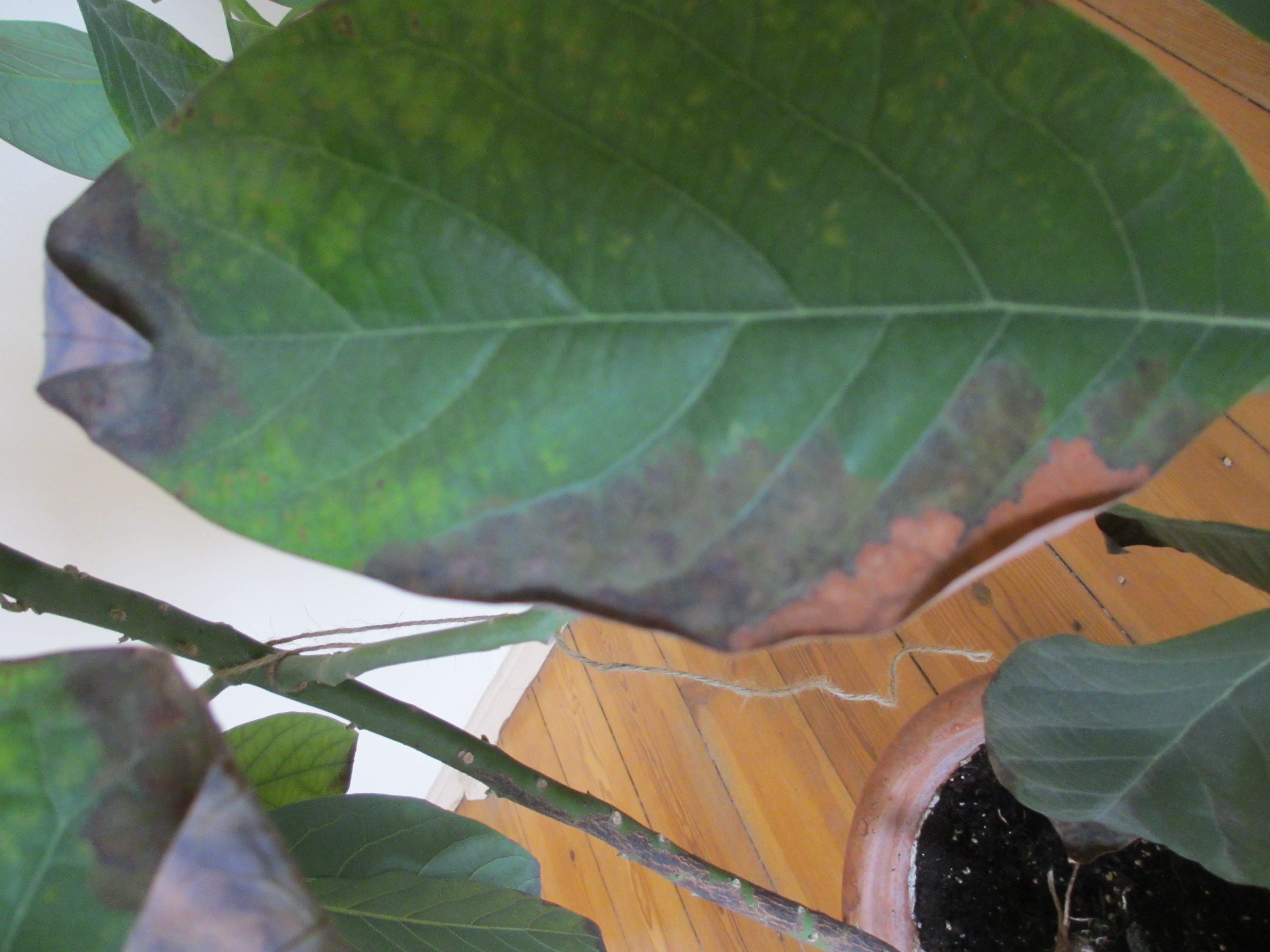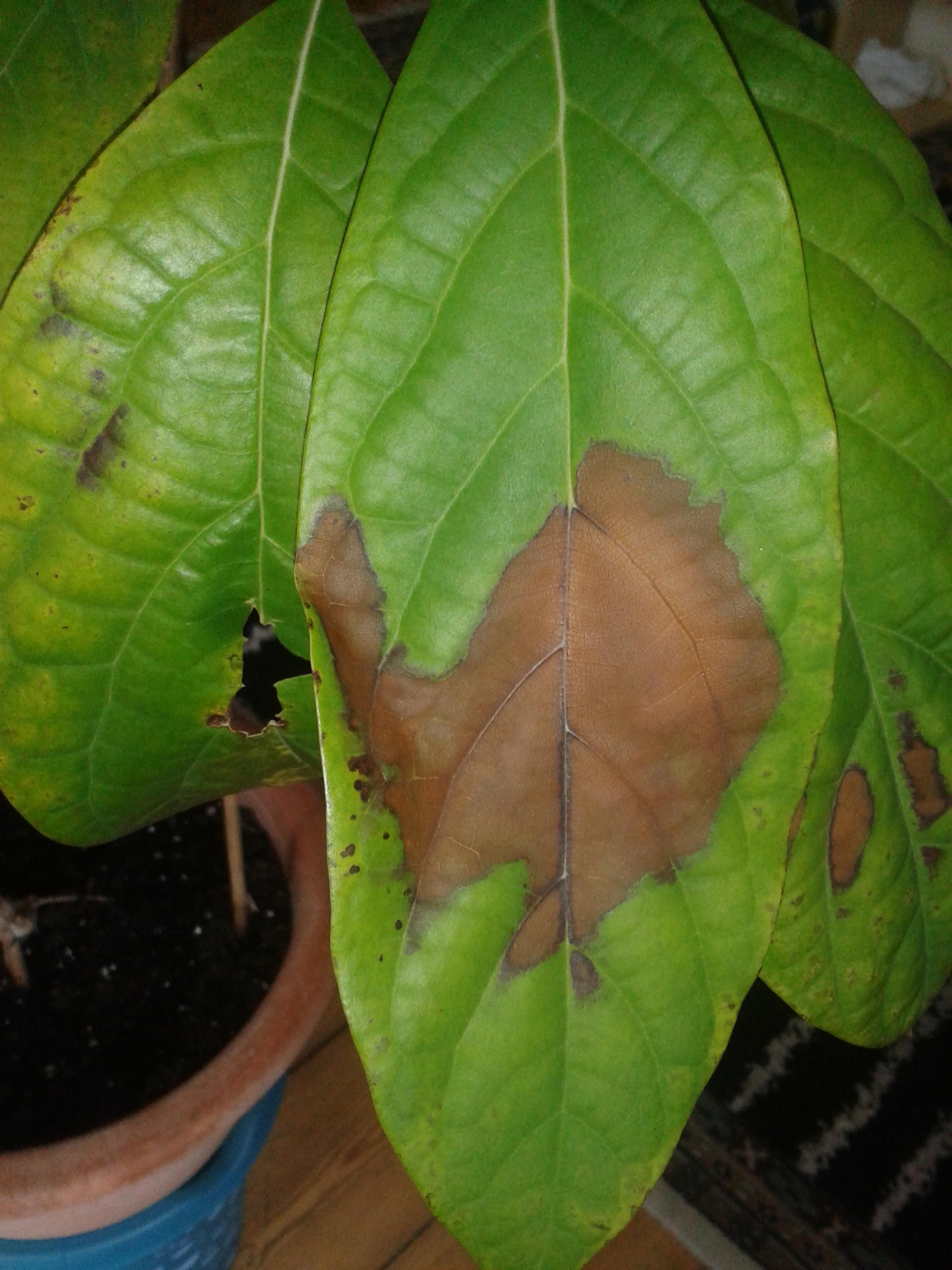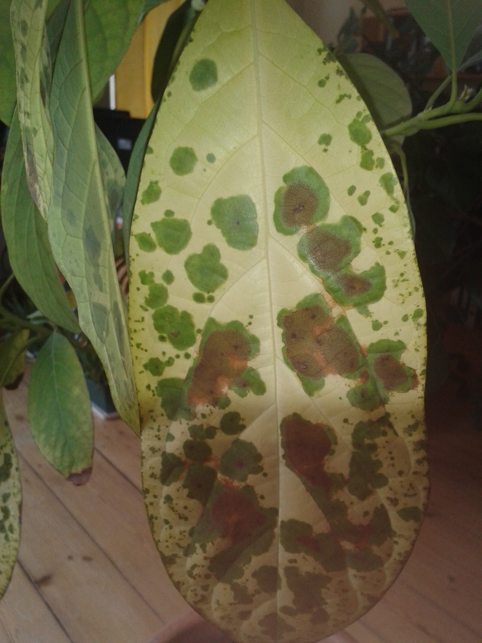 Meine Avocado(knapp 4 Jahre alt,Südfenster, wahrscheinlich zu nahe, gegossen immer nur im Untersetzer, gedüngt ca alle 2 Monate) hat massiv braune Flecken und eine gelbliche Grundfärbung an einigen älteren Blättern bekommen.