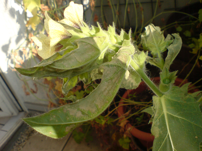 Ich habe mehrere Exemplare des einjährigen Bilsenkrauts (Hyoscyamus niger) und des Bauerntabaks (Nicotiana rustica). Seit ca. vier Wochen beginnt das Bilsenkraut zu welken, die oberen Blätter werden fleckig (jedoch nicht verfärbt!) und trocknen aus, schließlich stirbt die ganze Pflanze ab. Drei Pflanzen sind mir jetzt auf diese Weise nacheinander eingegangen. Der Bauerntabak beginnt auch die typischen Flecken zu zeigen, scheint aber insgesamt wesentlich robuster zu sein. Bisher ist noch keine Tabakpflanze eingegangen.