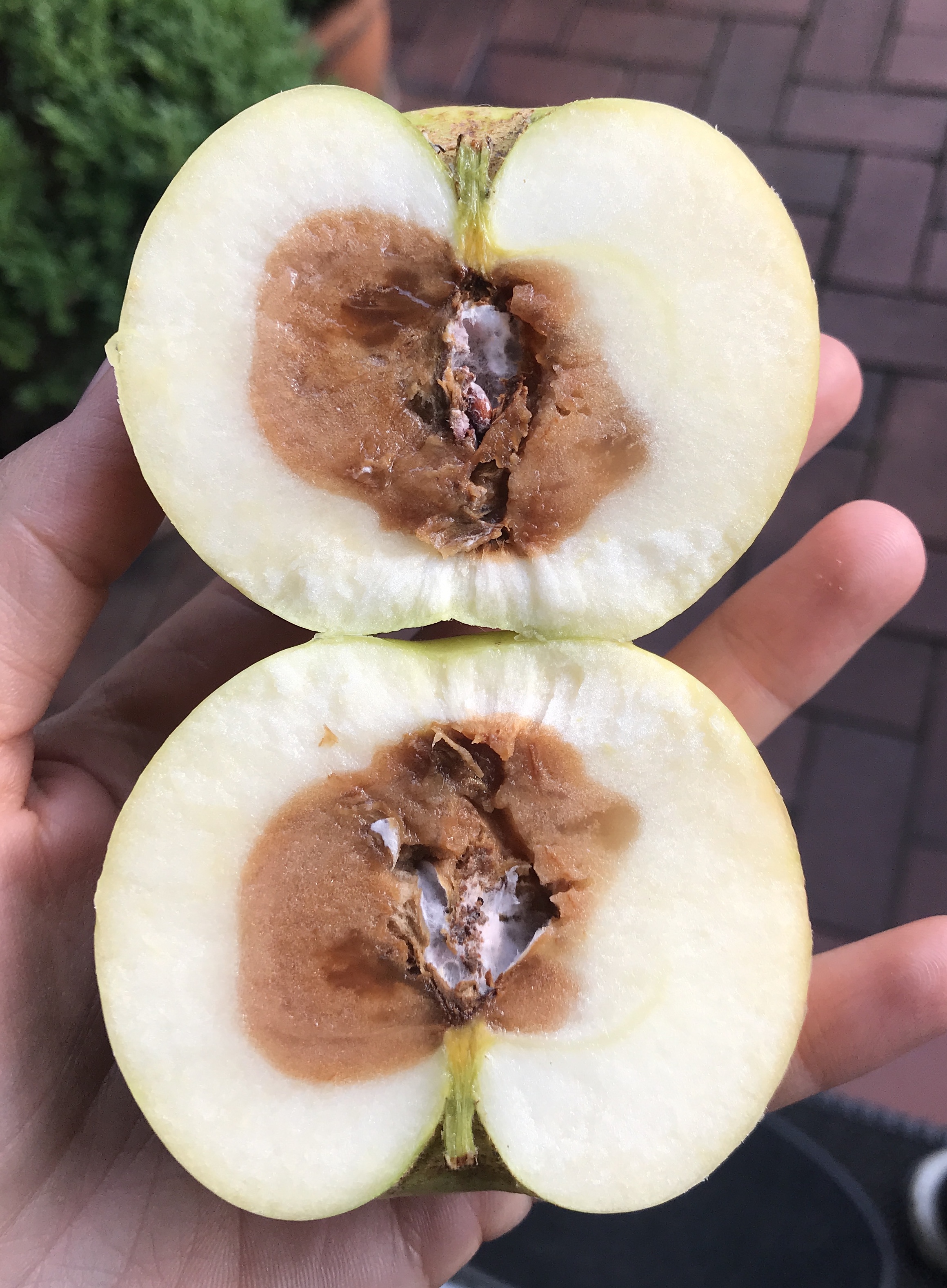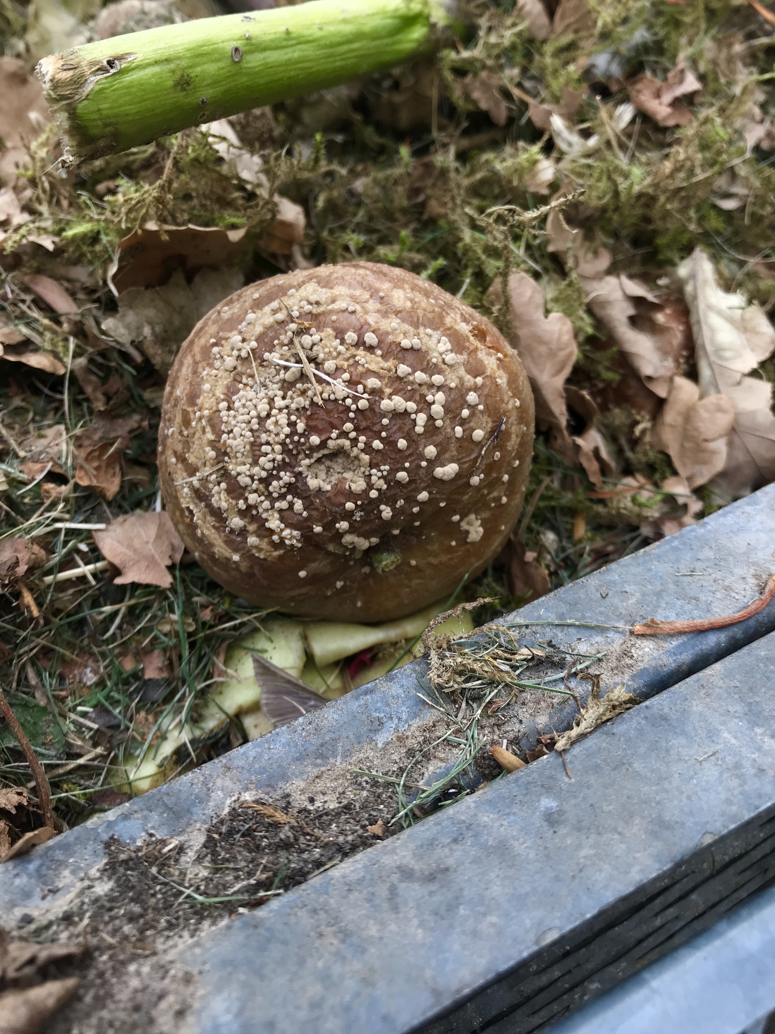 Es ist ein Dülmener Rosenapfel, der in diesem Jahr viele Fruchtmumien mit kreiselndem Schimmel produziert und stark verletzt ist.