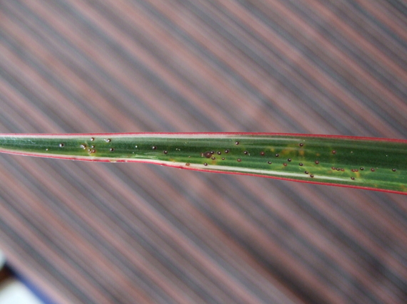 Ich habe vor einiger Zeit einen kleinen Drachenbaum gekauft (noch ohne Stamm) und dann kleine Punkte auf den Blättern bemerkt (siehe Bild)! Sind das Schädlinge oder eine Krankheit? Es sind kleine Blättchen, die sich leicht abmachen lassen. Kann das ansteckend sein, sodass ich ihn von den andern Pflanzen entfernt halten sollte?