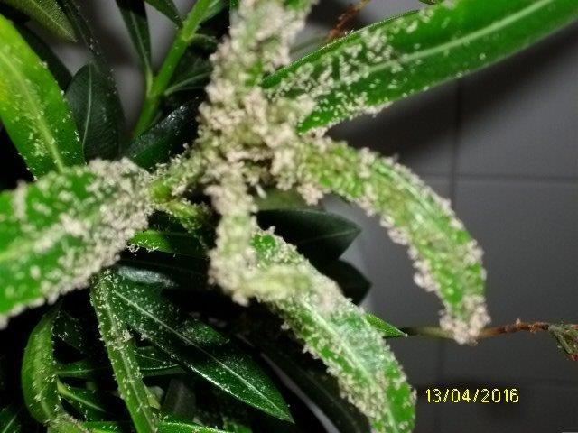 ich hab meine beiden Oleander im Treppenhaus überwintern lassen. Der eine hat das problemlos überstanden, der andere nicht: Er hat immer wieder trockene Blätter abgeworfen (ich hab ihn dann regelmäßiger gegossen), und als ich ihn jetzt rausstellen wollte, sah er so aus wie auf den beigefügten Bildern. Ich hab den Belag abgeduscht, dabei ist ein (völlig vertrockneter) Ast abgebrochen, und dann vorsichtshalber mit einem Schädlingsspray eingesprüht. Worum kann es sich bei dem Belag handeln? Und kann ich die Pflanze noch retten, oder soll ich sie lieber entsorgen, bevor sie andere Pflanzen auf dem Balkon "infiziert"?