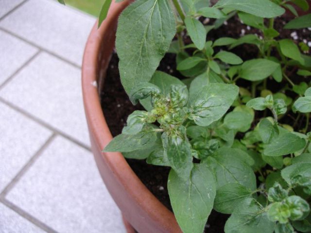 Mein Oregano hat seit einiger Zeit gekräuselte Blätter an den Spitzen der Triebe. Letzte Woche habe mir einen neuen Basilikumstock (von Gärtnerei) gekauft. Jetzt zeigt er auch schon ähnliche gekreuselte Blätter wie der Oregano. Außer den gekreuselten Blättern befinden sich Oreganotopf auch noch kleine Tierchen ähnlich Minifruchtfliegen.