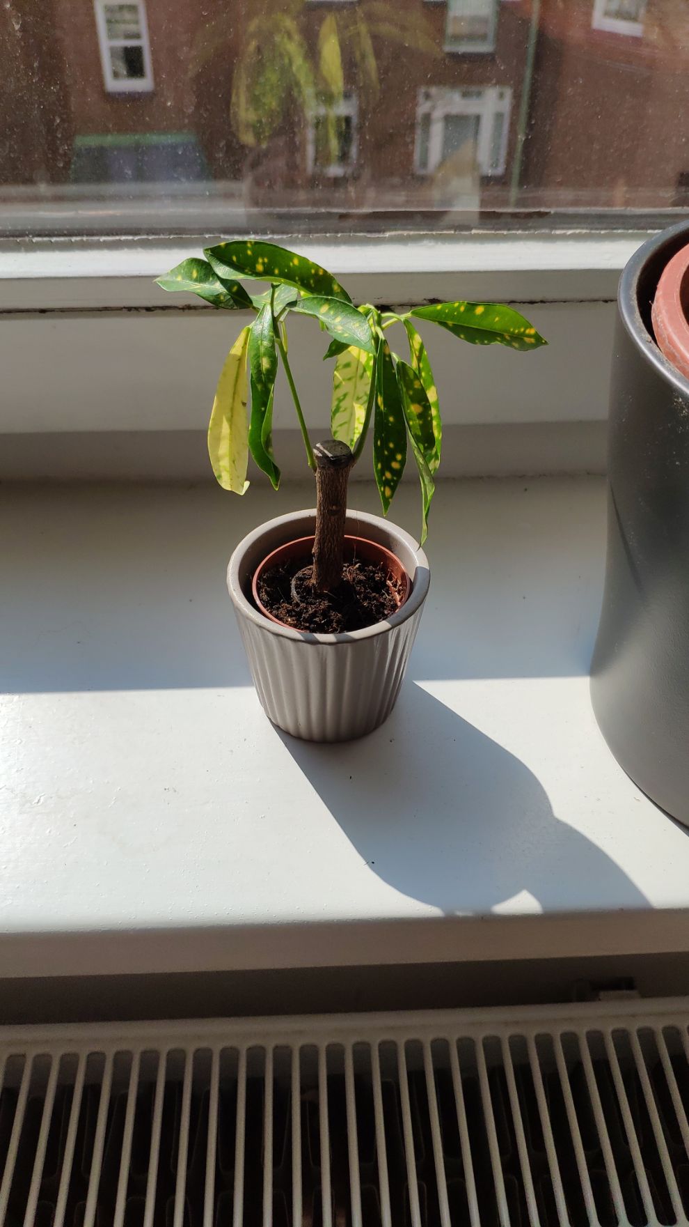 seit zwei Wochen will mein lieber Mini-Kroton nicht mehr. Er lässt ganz traurig die Blätter hängen. Ich weiß leider nicht wodran das liegen könnte. Ich habe ihn ein wenig gedüngt, er bekommt sehr viel Licht ab und die Erde ist eigentlich auch immer feucht. Habt ihr eine Idee was dort los sein könnte? Vielleicht macht ihm dieser mickrige Pflanzentopf zu schaffen.