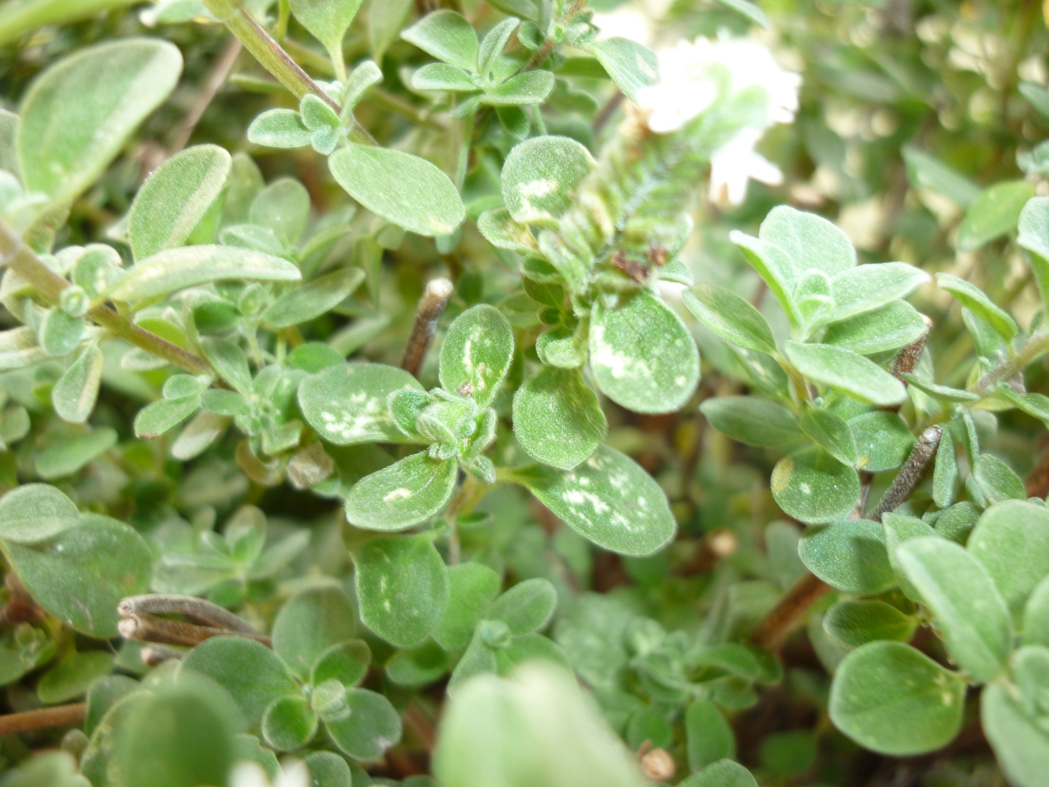 Die Blätter meines Zitronenthymians sind außerdem mit einer weißen Staubschicht überzogen. Tiere sehe ich da keine.